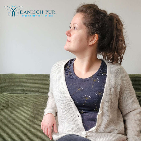 Coupon 50 cm Reduziert wegen schmalerer Breite (Randdruck fehlerhaft): Singlejersey Bio Wolle Seide Pusteblumen auf Kohlrabenblau (70% Schurwolle Merino, kbt, mulesingfrei, 30% Seide)