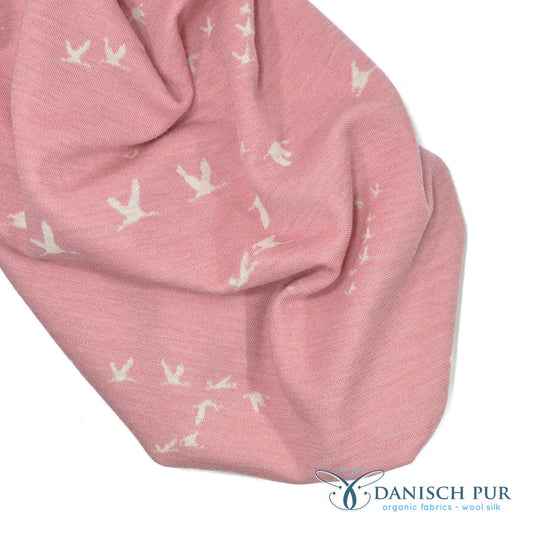 Coupon Paket 70 cm Bio Wolljersey Jacquard Kraniche auf Rosa, 30 cm Bio Wolle-Hanf rosa melierter Kuschel-Fischgrat, 50 cm Bio Wollbündchen rosa meliert Rippe im Schlauch