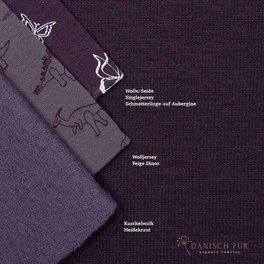 Singlejersey Bio Wolle Seide Schmetterlinge auf Aubergine (70% Schurwolle Merino, kbt, mulesingfrei, 30% Seide)