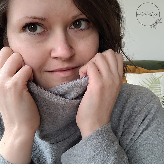Dieser besteht ebenfalls aus 100% Merinowolle (kbt, mulesingfrei) und ist ein gestrickter, dehnbarer Stoff, der auf einer Seite die typischen Schlaufen aufweist, die man von Baumwollhandtüchern kennt. Auf der anderen Seite ist er glatt wie ein normaler Strickjersey.