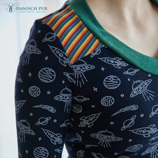 Coupon 90 cm Bio Wolljersey Planeten auf Navy (kbt, mulesingfrei)