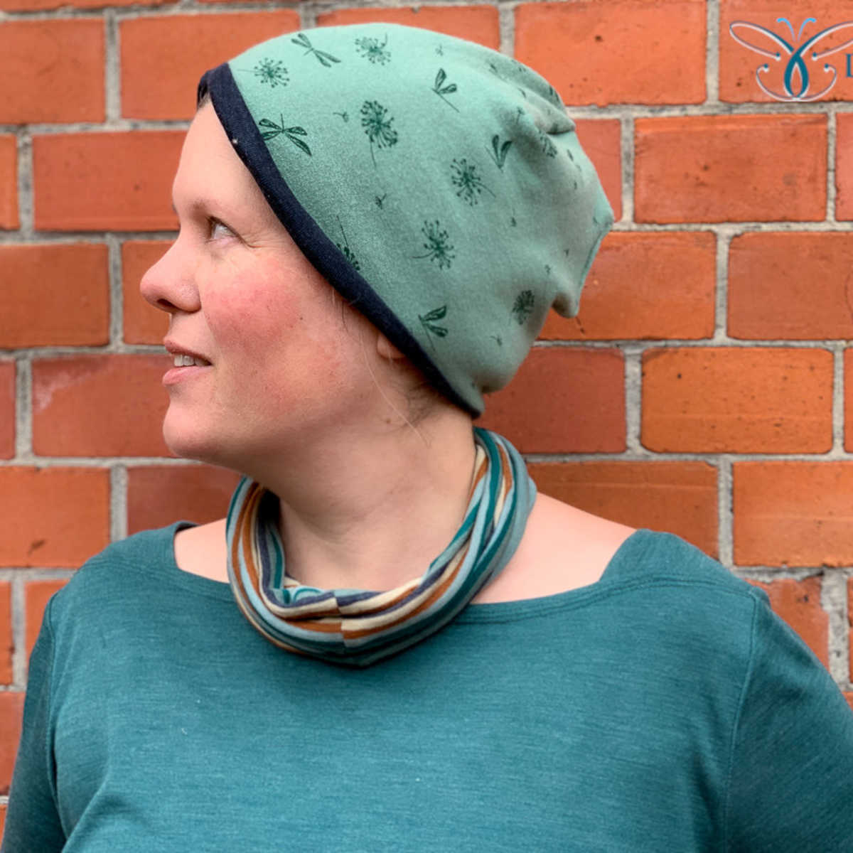 You can see the pattern Frau Marlene from Studio Schnittreif , the hat "Einfachwärme Ohren" from mach-es-einfach made of wool/silk Kohlrabenblau (inside terry cloth dragonflies on sage), which you can also buy in the shop and a skirt "Wilder Pfeffer" from Firlefanz made of Gewitterhimmel Kuschelwalk .