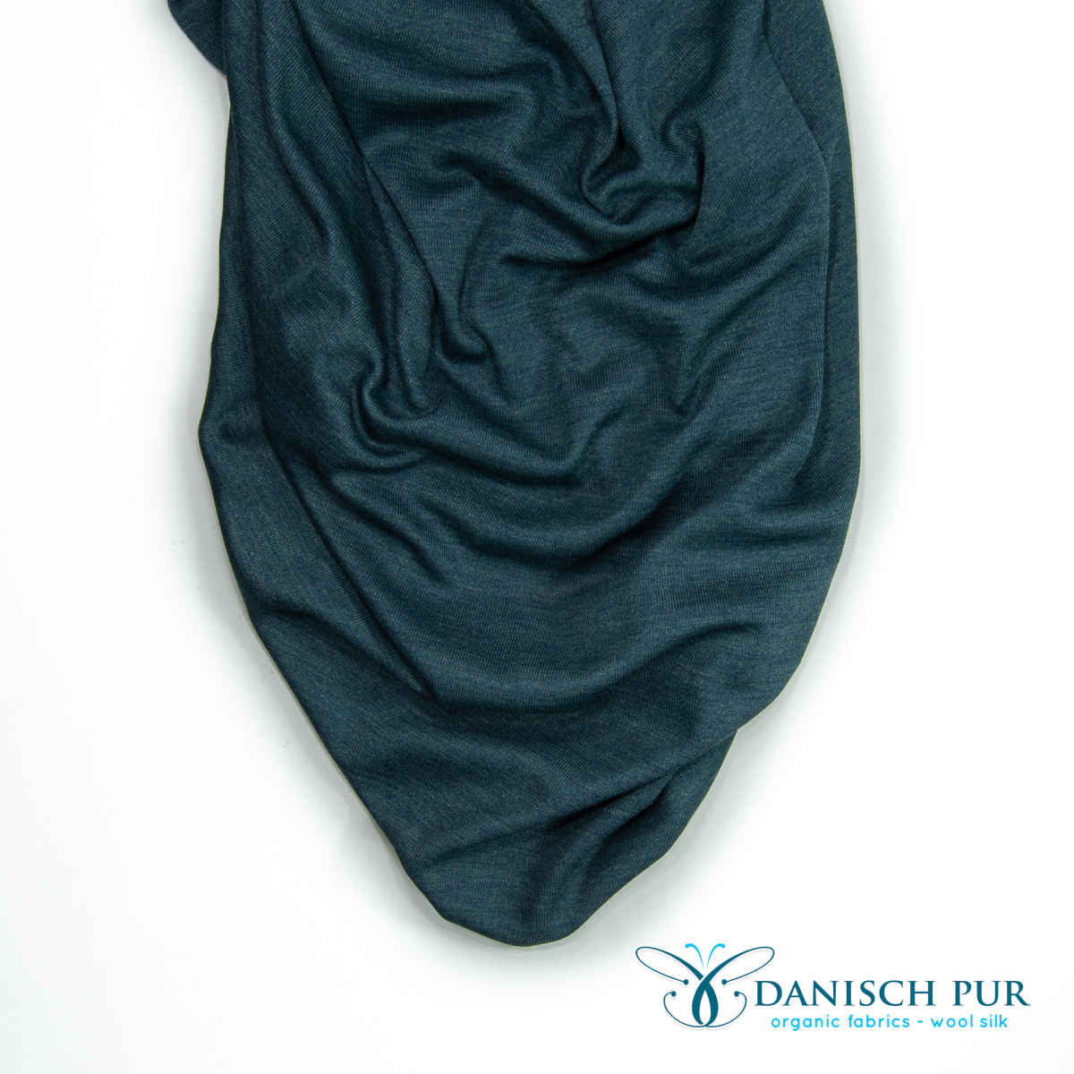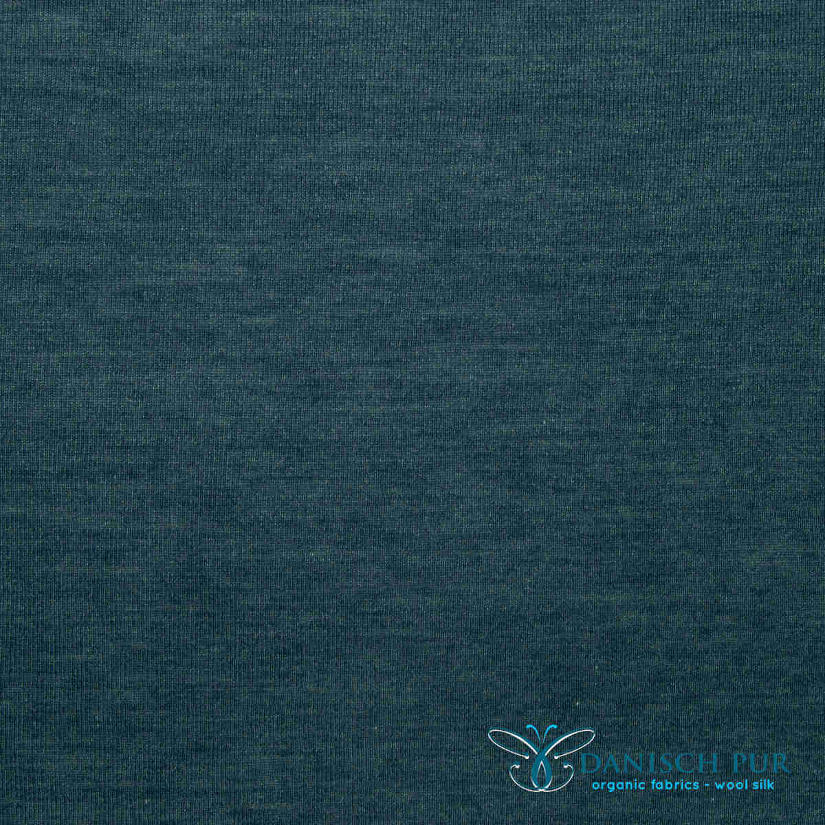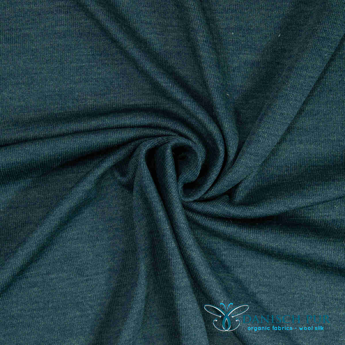 Here, the wool-silk fabric is offered in a solid color: steel petrol. The shade is a rather medium-dark and heathered petrol.