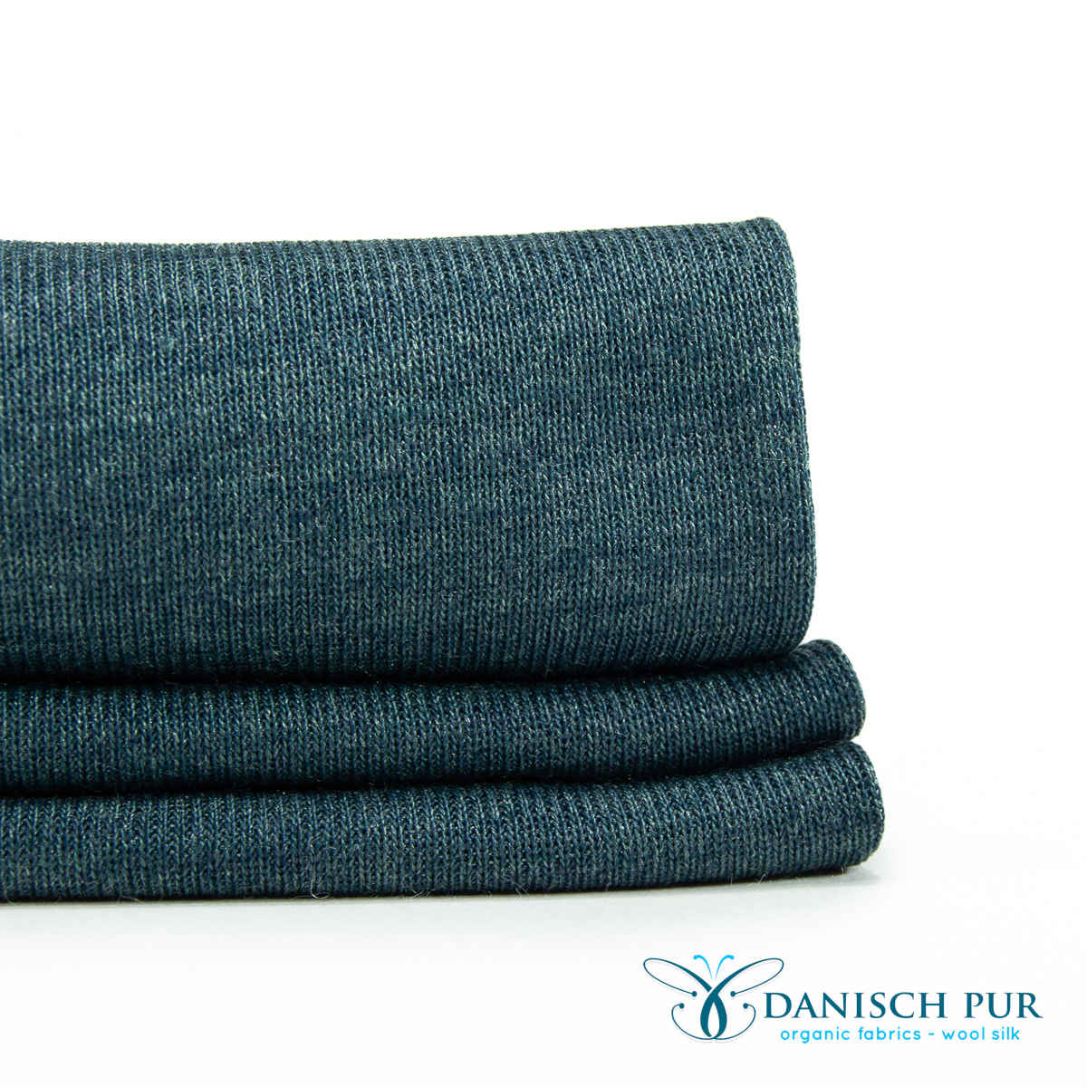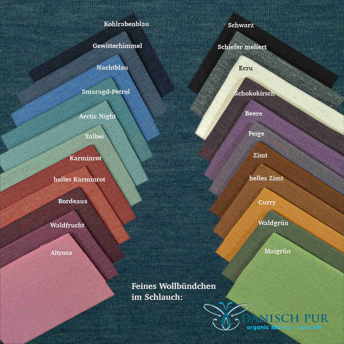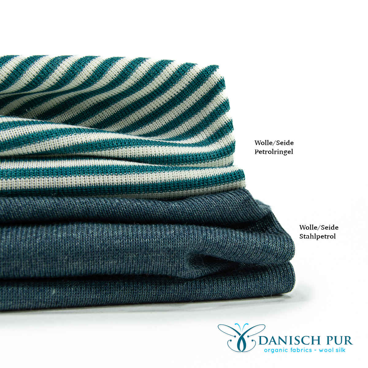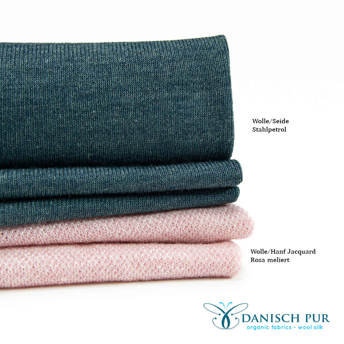 Wool/silk is inherently very stretchy and can also be used for cuffs (with a small stretch factor of, for example, 0.6). If more support is needed, for example at necklines that are subject to a lot of wear (tugging children ;-) ) or as trouser cuffs, then the slightly more stable wool jersey is also well-suited. We also have special wool ribbing fabric for lightweight fabrics .