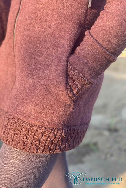 Here you can see the Miss Zip Up jacket from Nähcram combined with our cuddly wool fleece in chocolate cherry melange.