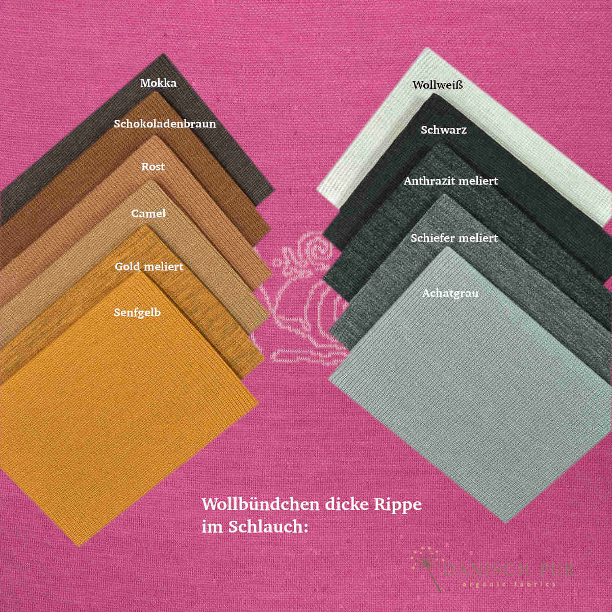 Our organic wool jersey fabric (kbt, made from 100% new wool, merino) is produced according to the highest ecological criteria. It is therefore particularly suitable for the sensitive skin of babies and toddlers, as well as for all clothing that is worn close to the skin. Outerwear is also given something very special by the delicate shimmer of the wool fabric, so that the fabric is also ideal for adult clothing.