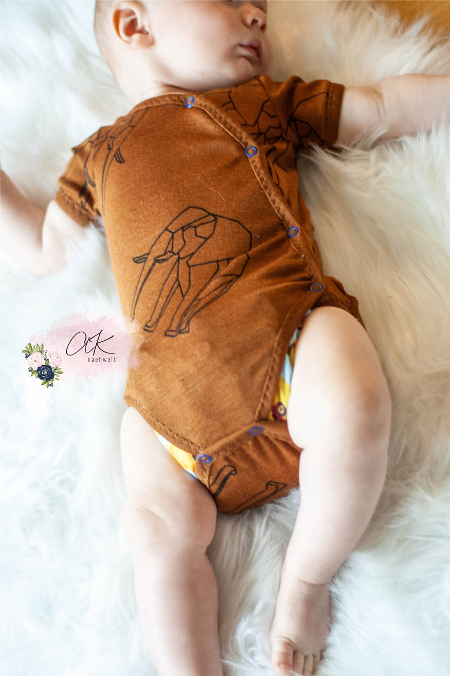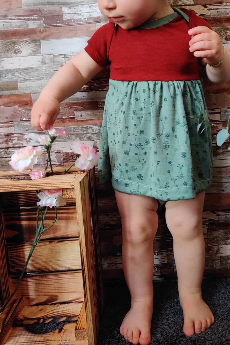 The e-book contains extra pattern pieces for cloth diapers, which are also designed for thick diaper packs. The dandelion grows with your child - thanks to the gathering in the diaper area. Even leftovers are no problem with the integrated fabric-saving variant, in which the pole flap is sewn on separately.