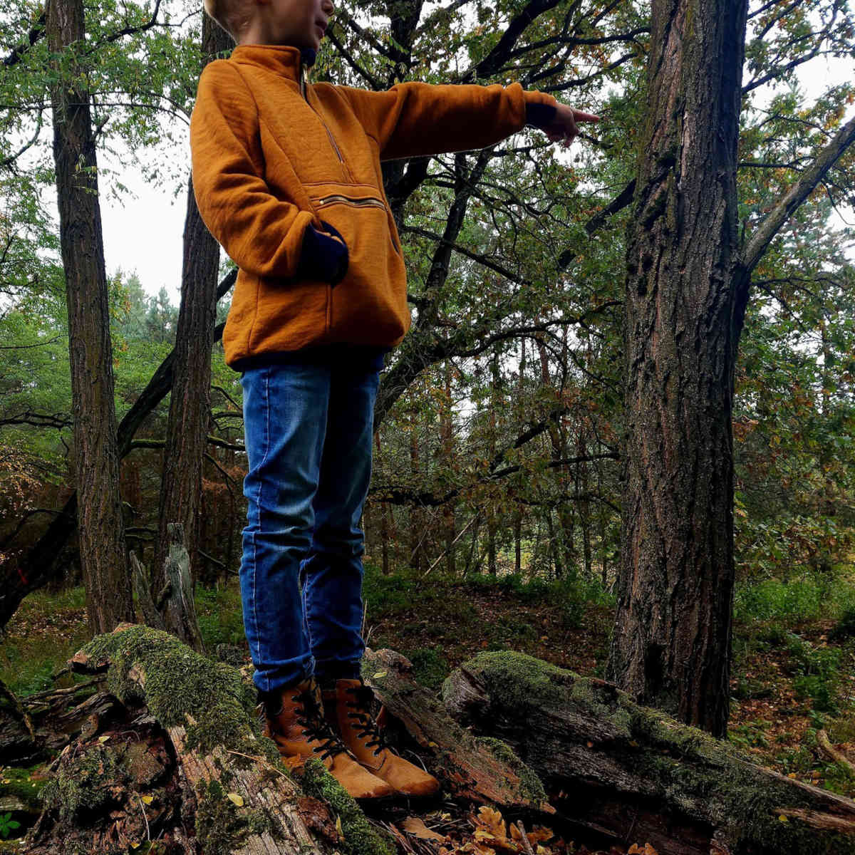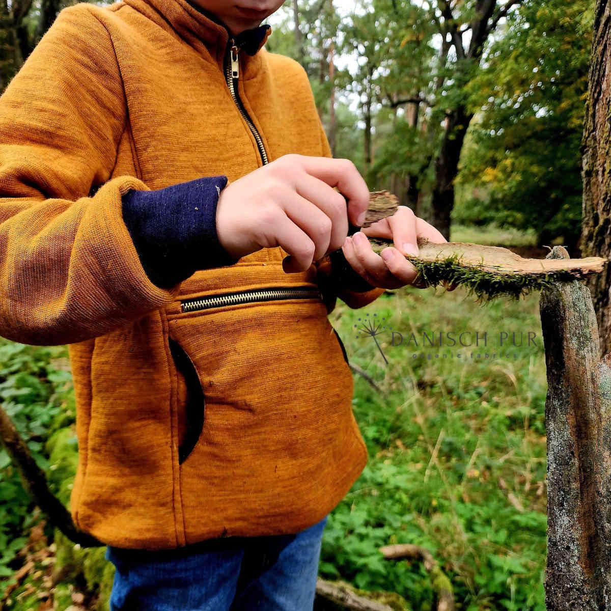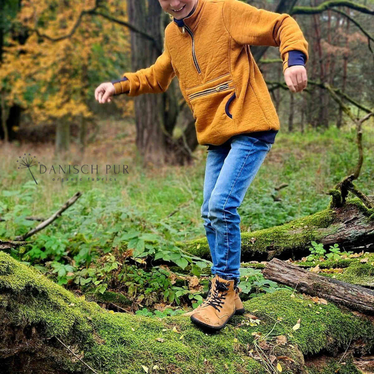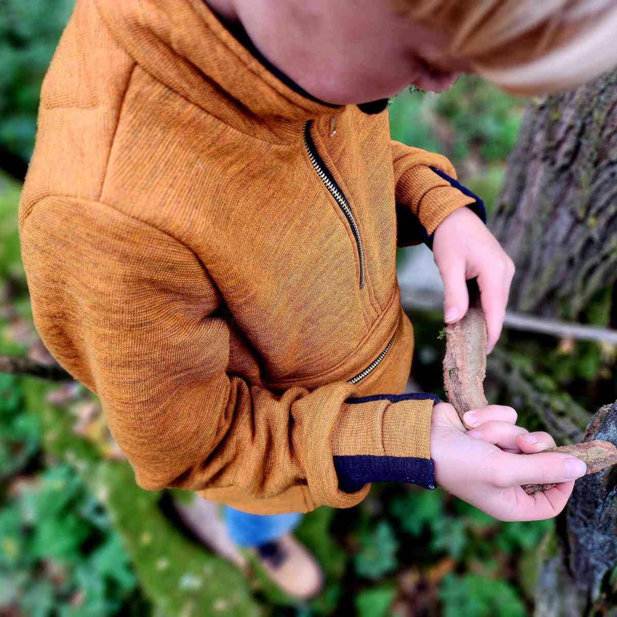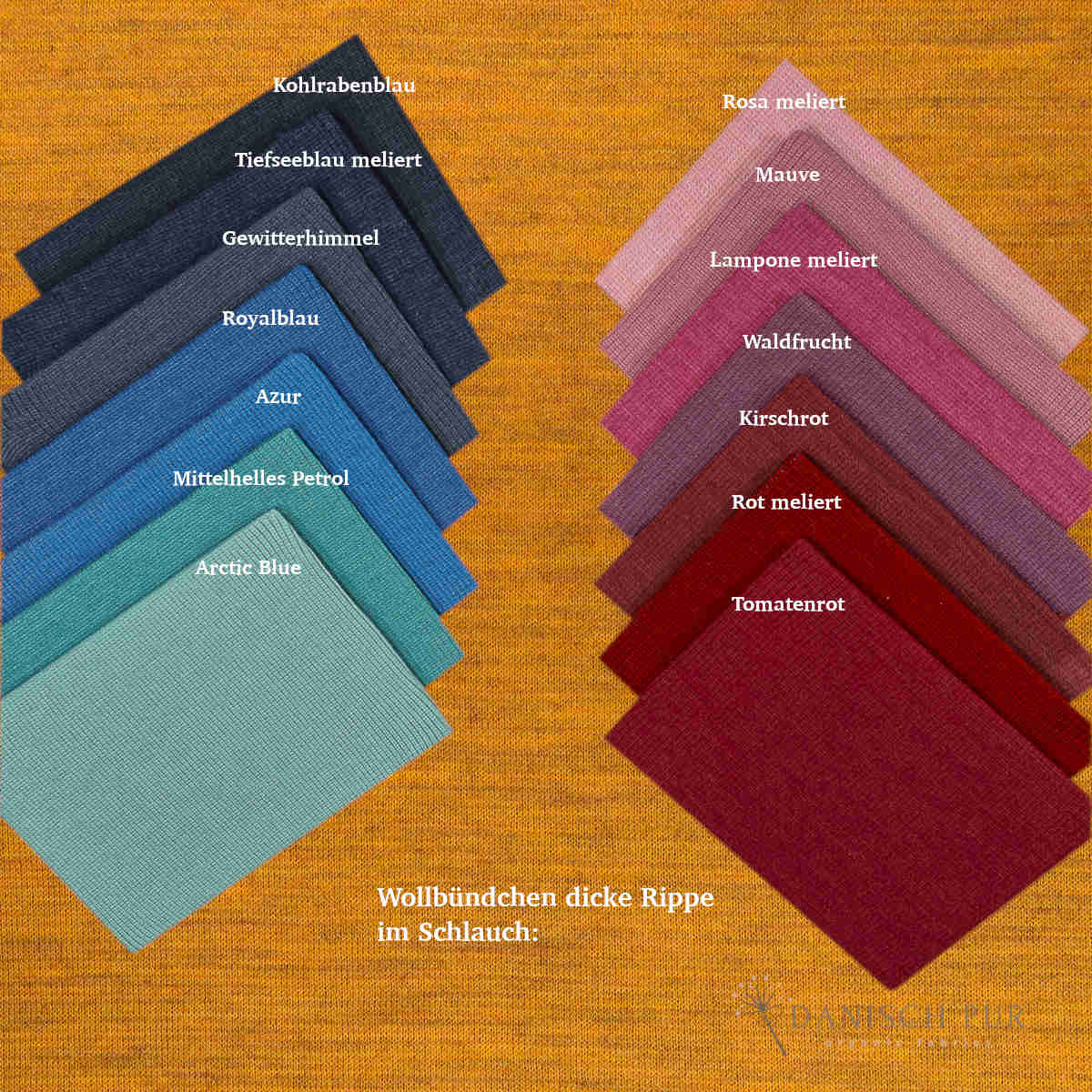 Da der Stoff etwas schwerer ist, empfehlen wir hier für guten Halt als Bündchenstoff die schwere Rippe im Schlauch. Zu den gold melierten Wollfleece haben wir ein Wollbündchen aus der gleichen Wollfaser stricken lassen, was daher farblich exakt passt.