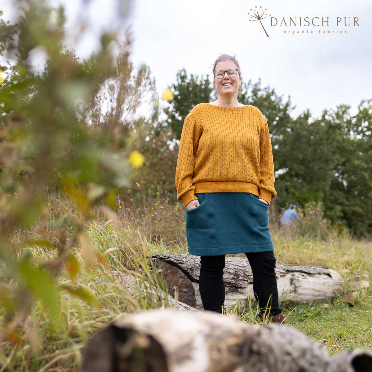 Im zweiten Beispiel seht einen schlichten und dennoch raffinierten Pullover aus Zopfstrick Gold meliert mit passendem Wollbündchen. Das Schnittmuster "Alice" von Fibre Mood kann mit dem V-Ausschnitt sowohl vorne als auch hinten getragen werden. Den Rock "Wilder Pfeffer" von Firlefanz habe ich aus dem Kuschelwalk in Ocean Petrol mit dicken Wollbündchen kombiniert.