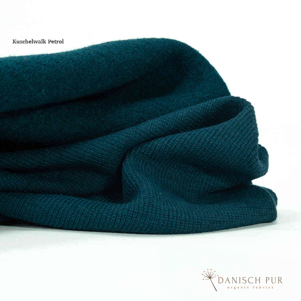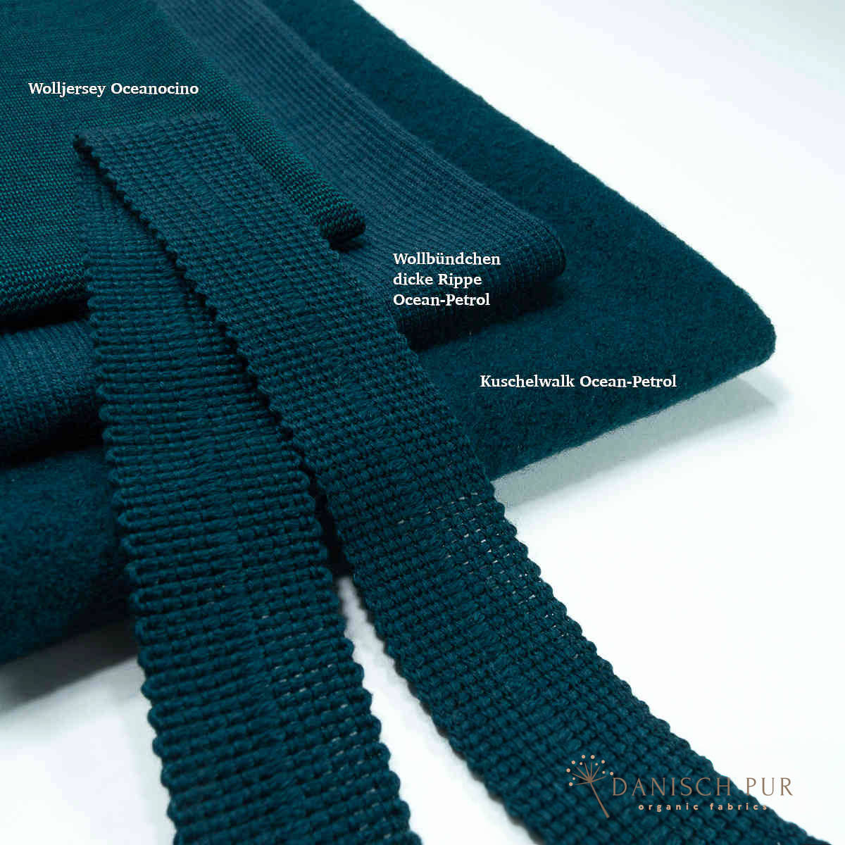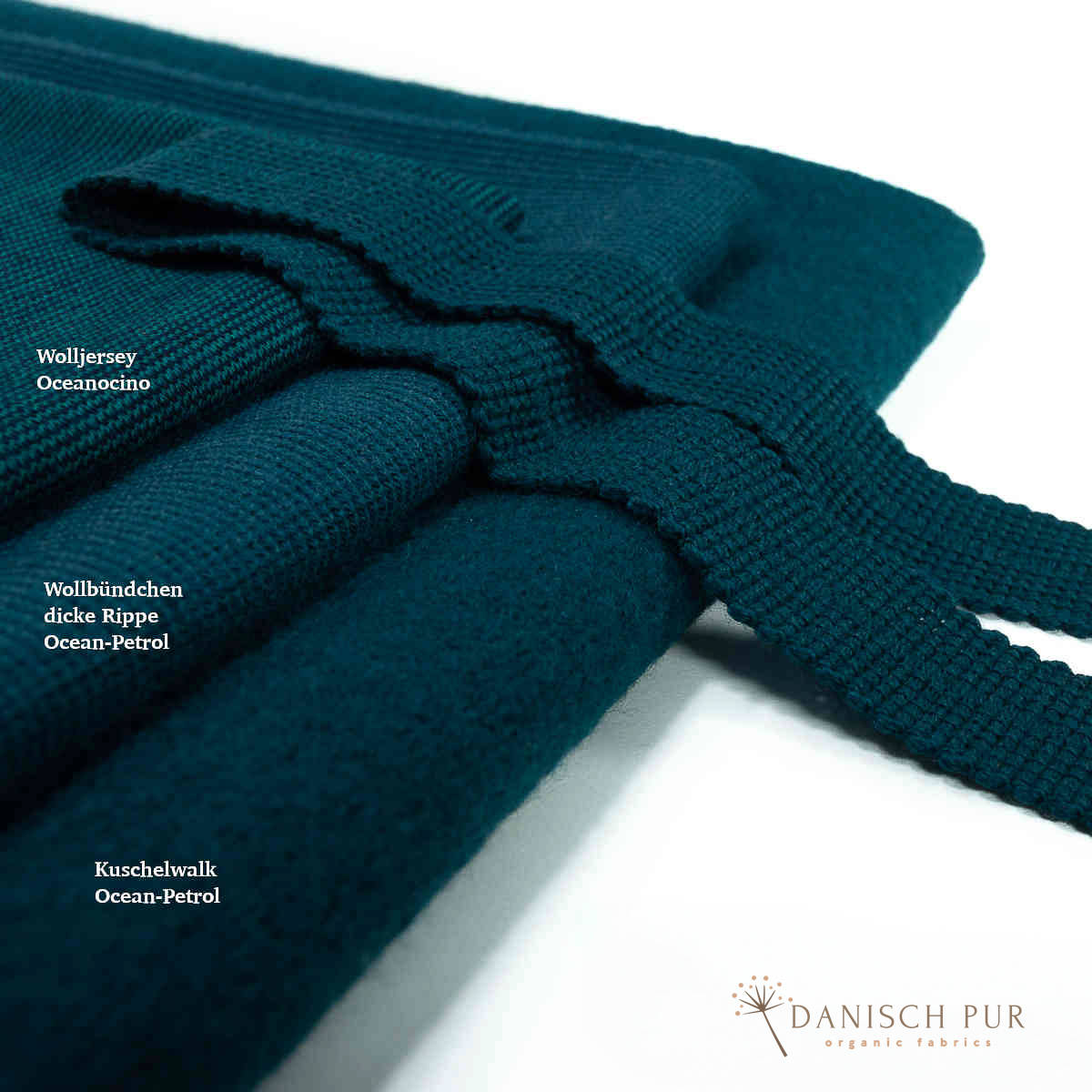 Hier erhaltet ihr das Wollbündchen in der Farbe Ocean Petrol. Der Farbton dem Kuschelwalk der Farbe "Ocean Petrol" nachgefärbt. Das hat zu 99% geklappt - das Wollbündchen ist leicht heller und gaaaanz leicht bläulicher. Siehe Fotos.