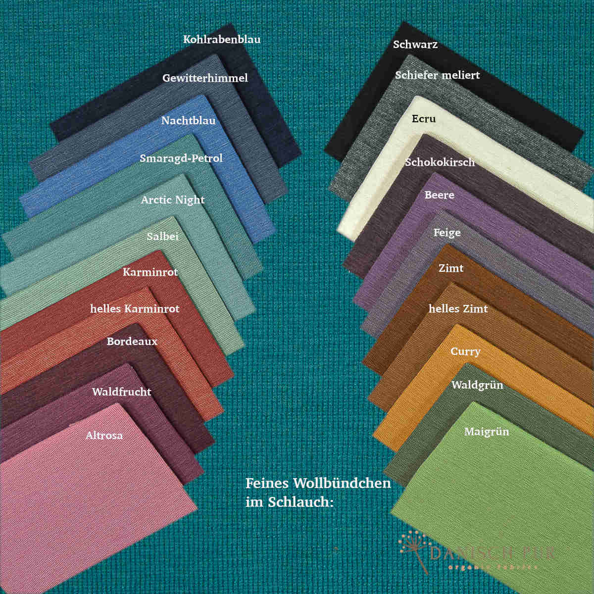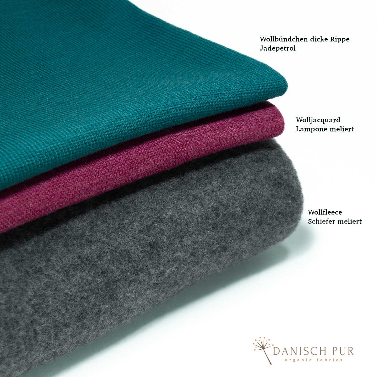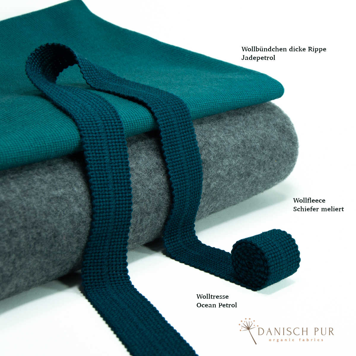 Außerdem lässt es sich super zu diversen Wolltressen (besonders natürlich der JadePetrol Wolltresse, die hier nicht auf den Fotos ist), unserem Schiefer Wollfleece und anderen Farben kombinieren (siehe Galerie).
