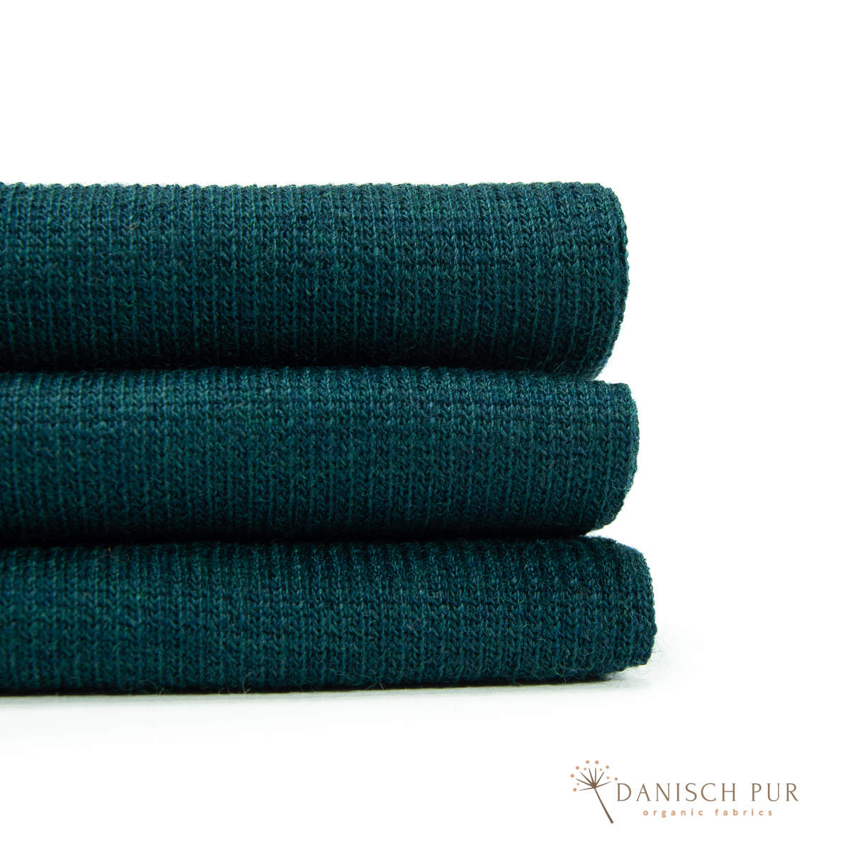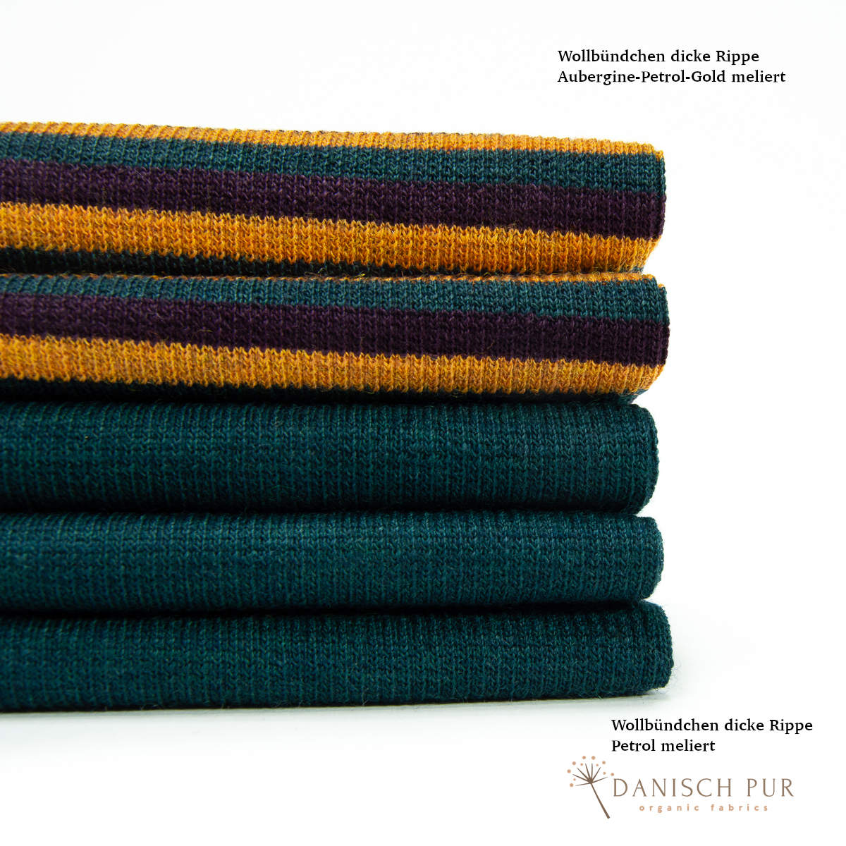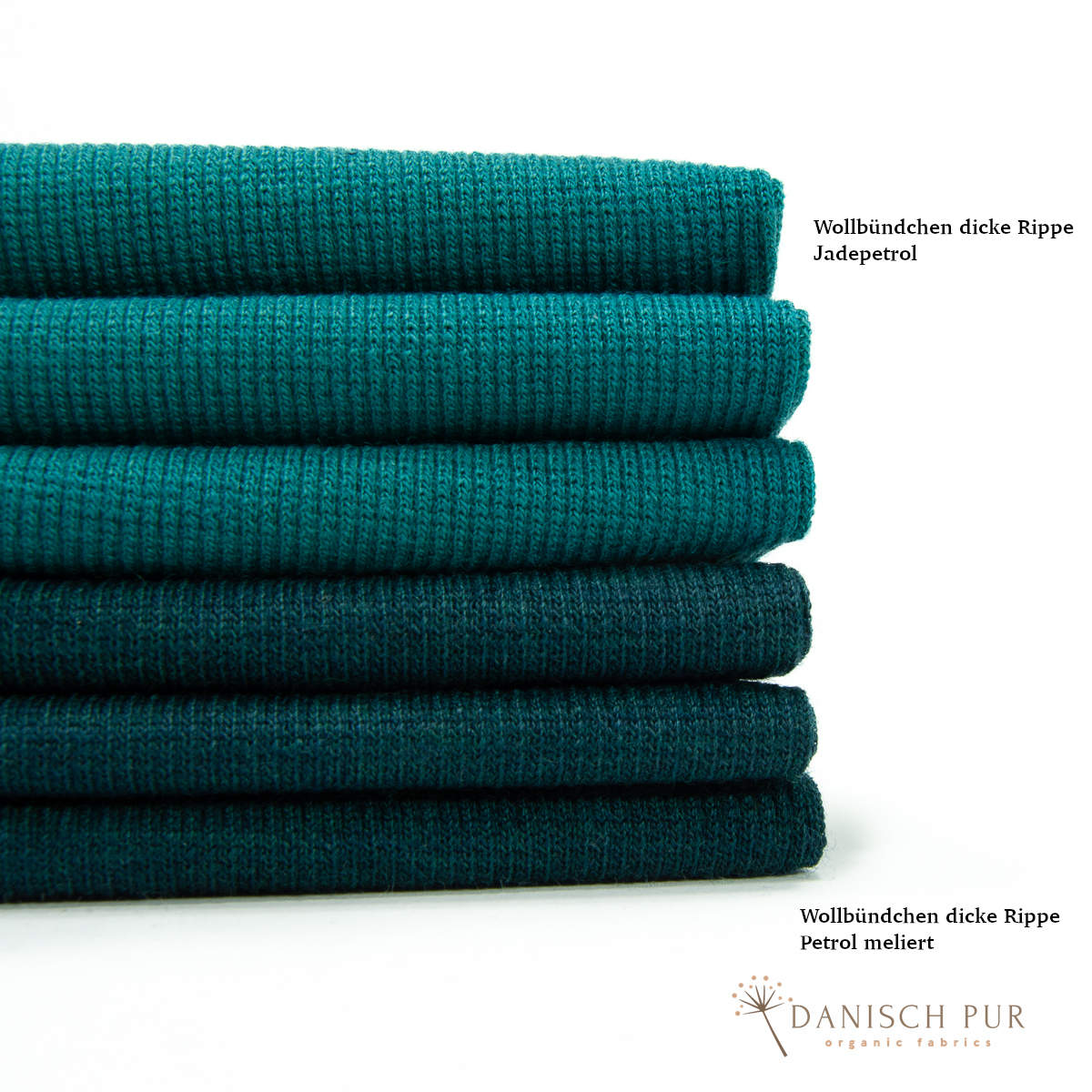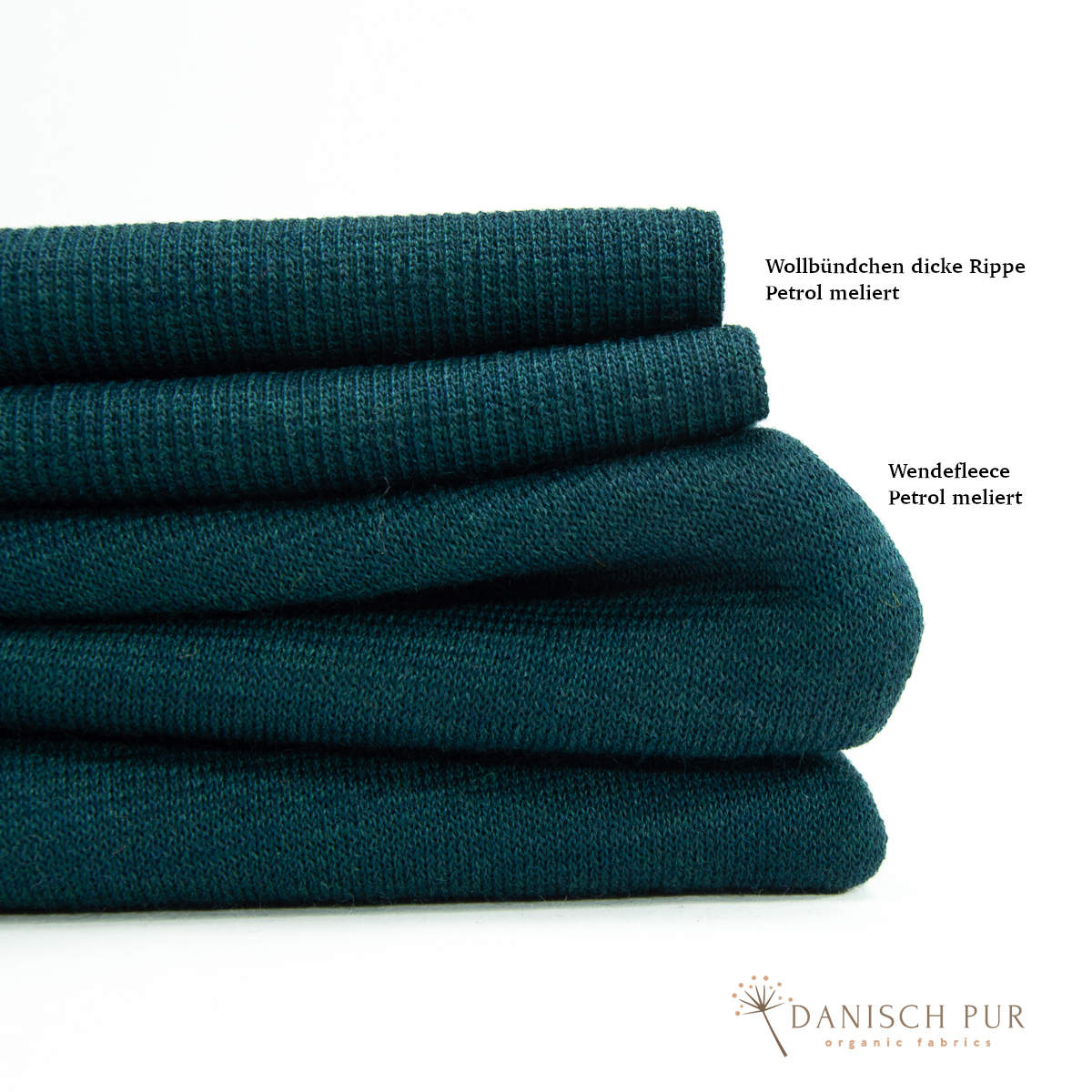 Hier erhaltet ihr das Wollbündchen in der Farbe Petrol meliert. Der Farbton wurde aus demselben Garn, wie der Wendefleece der Farbe Petrol meliert gestrickt.