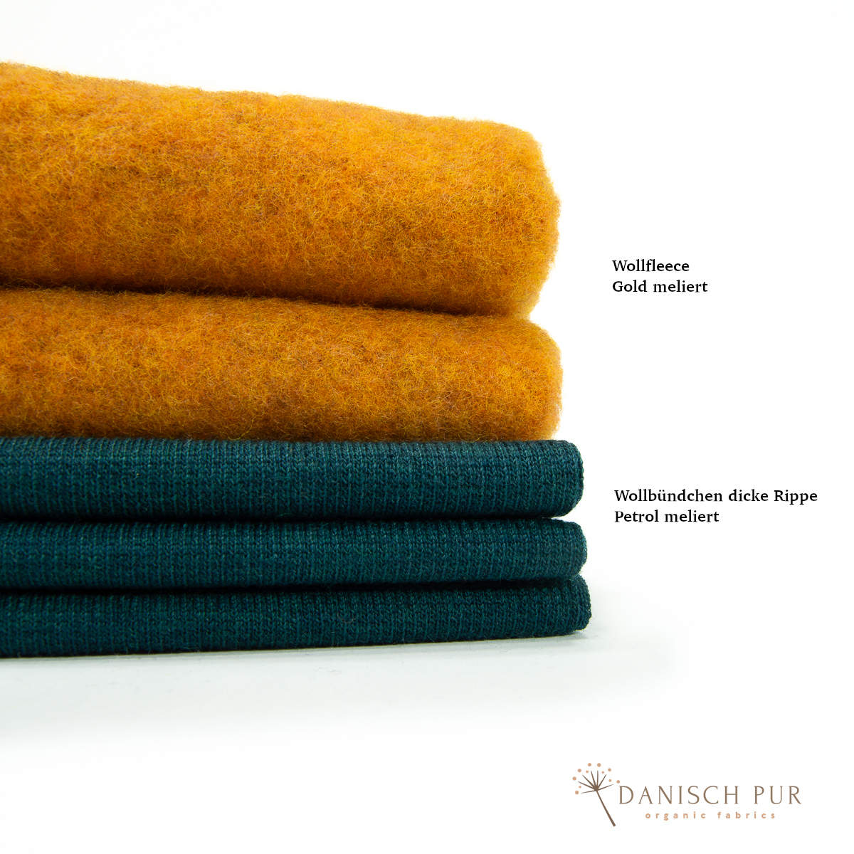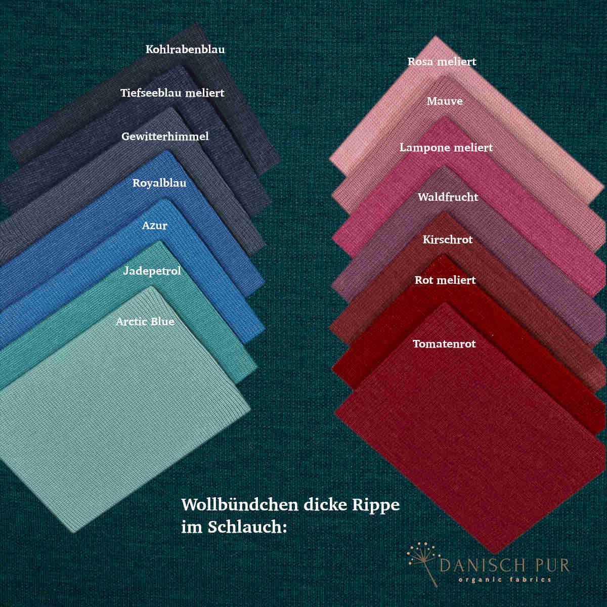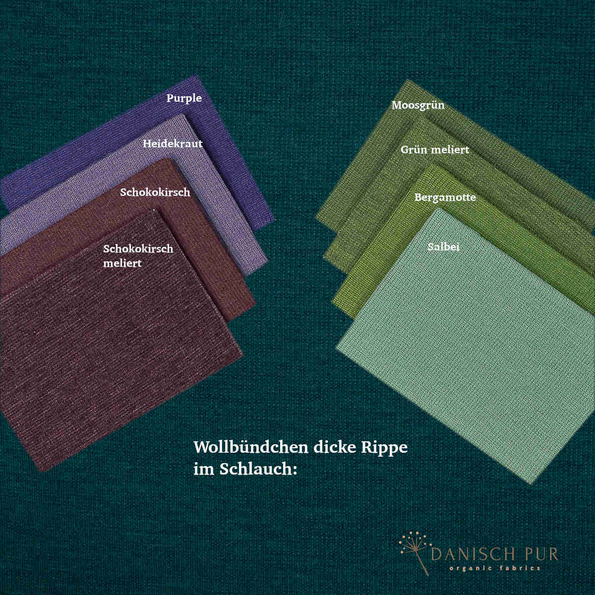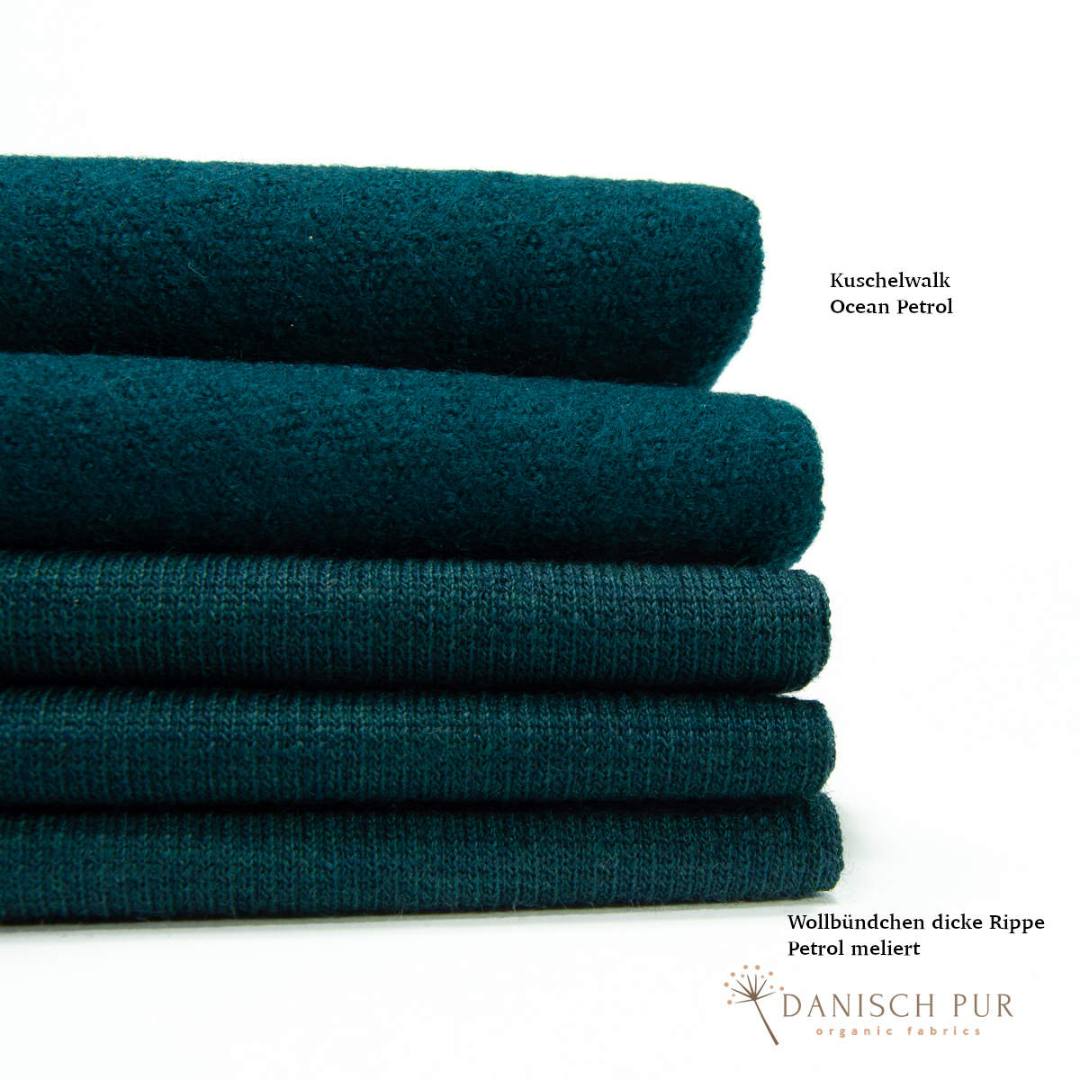 Hier erhaltet ihr das Wollbündchen in der Farbe Petrol meliert. Der Farbton wurde aus demselben Garn, wie der Wendefleece der Farbe Petrol meliert gestrickt.