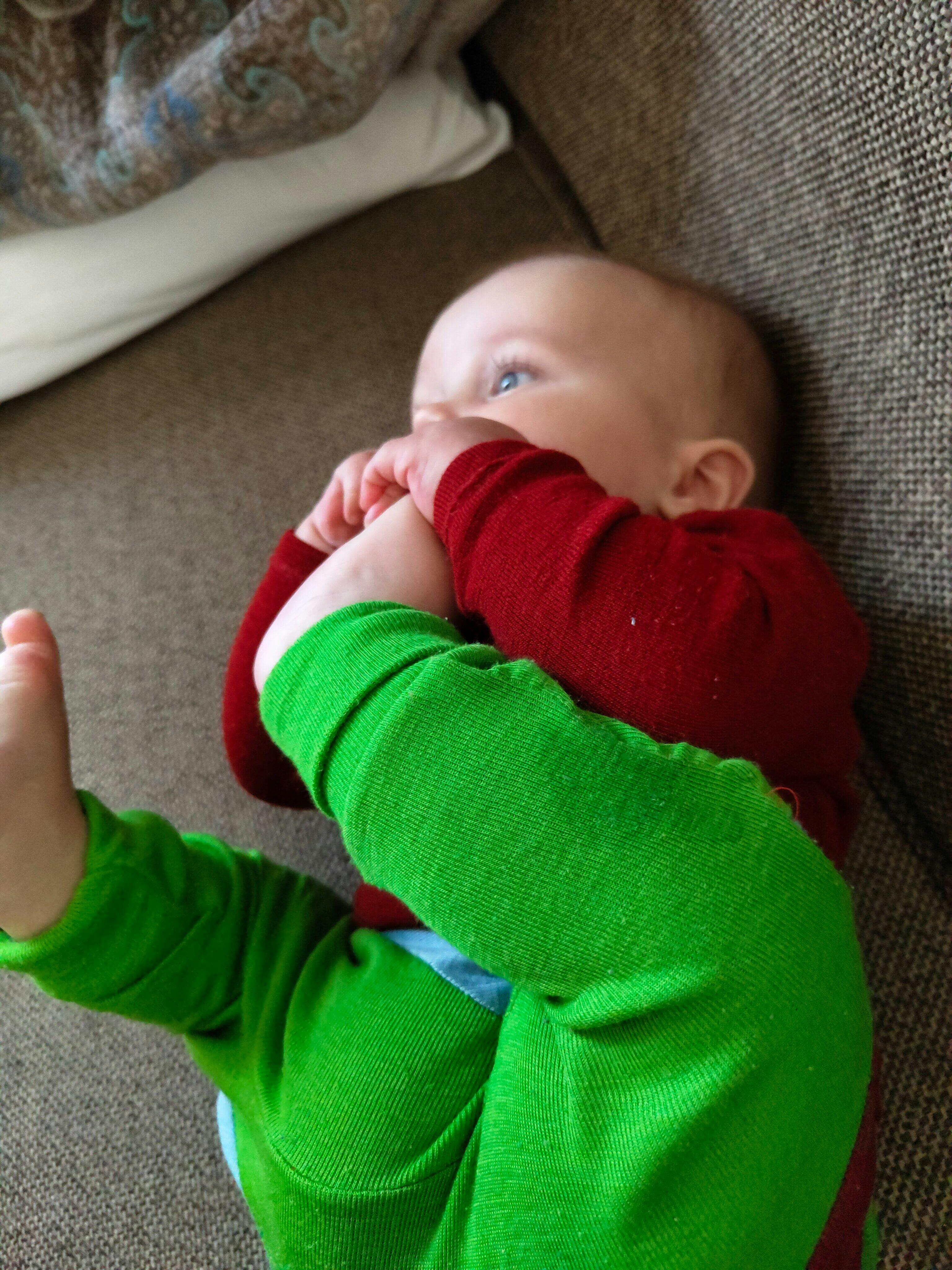 Hier sieht man unser Wendeshirt Emil&Emilia - ganz schlicht mit wollweißer WolleSeide als Bündchen an Arm und Hals.