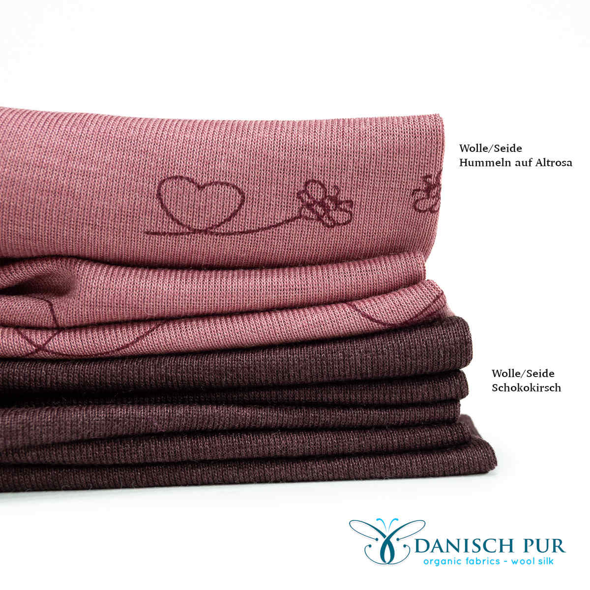 Schokokirsch ist ein edler Allrounder, der super mit allen anderen Wolle/Seide Stoffen kombiniert werden kann. Vor allem die Hummeln auf Altrosa die Hexen-Regenbogenringel passen super dazu.