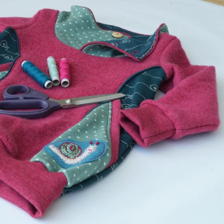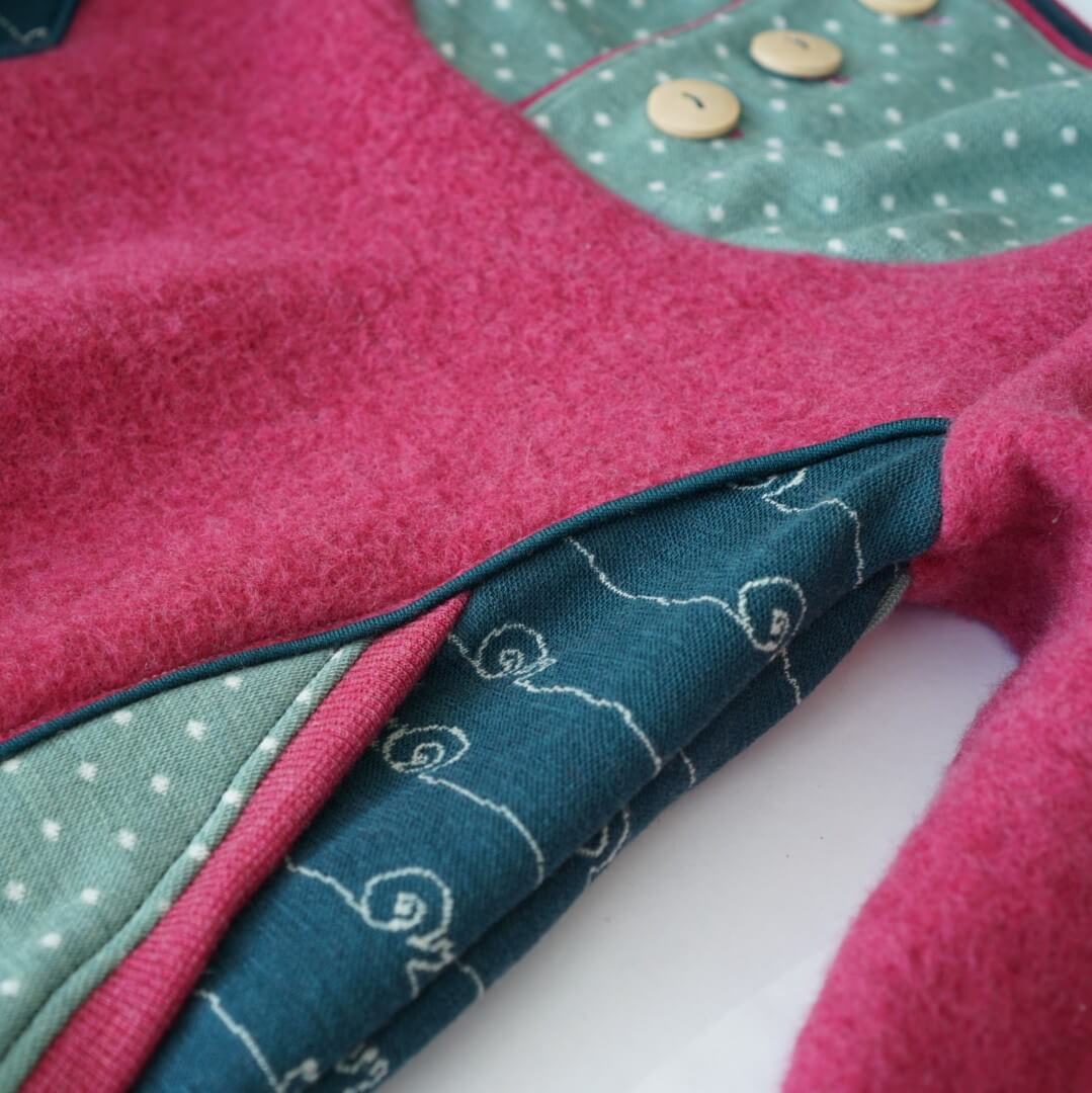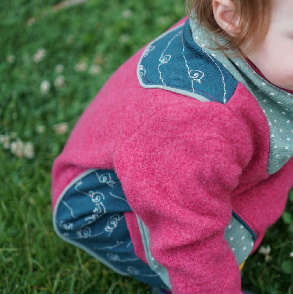 Noch ein weiteres Designbeispiel zeigt das "Bonnie und Kleid" Kleidchen von Rabaukowitsch. Genäht aus Lampone Fleeece, Lamponebündchen, Salbeipunkten, Petrolschnecken und als Paspeln ebenfalls Lampone Bündchen, Salbei Bündchen, Petrol Wolljersey.