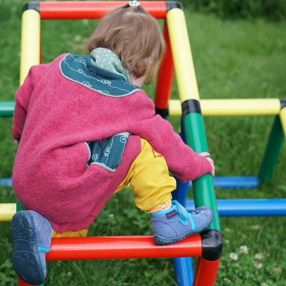 Ihr seht eine Jacke, genäht und entworfen von LEMELdesign höchstpersönlich, kombiniert mit unserem dicken Wollbündchen in Schiefer meliert. Das Schnittmuster ist die Jacke Mullingar Kids.