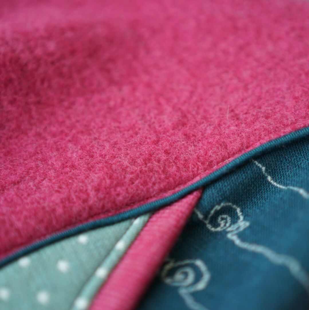 ... du die Kanten eines Walkstoffes nicht versäubern musst? Um einen schönen Abschluss zu haben kannst du zum Beispiel eine Wolltresse um die Kanten nähen.