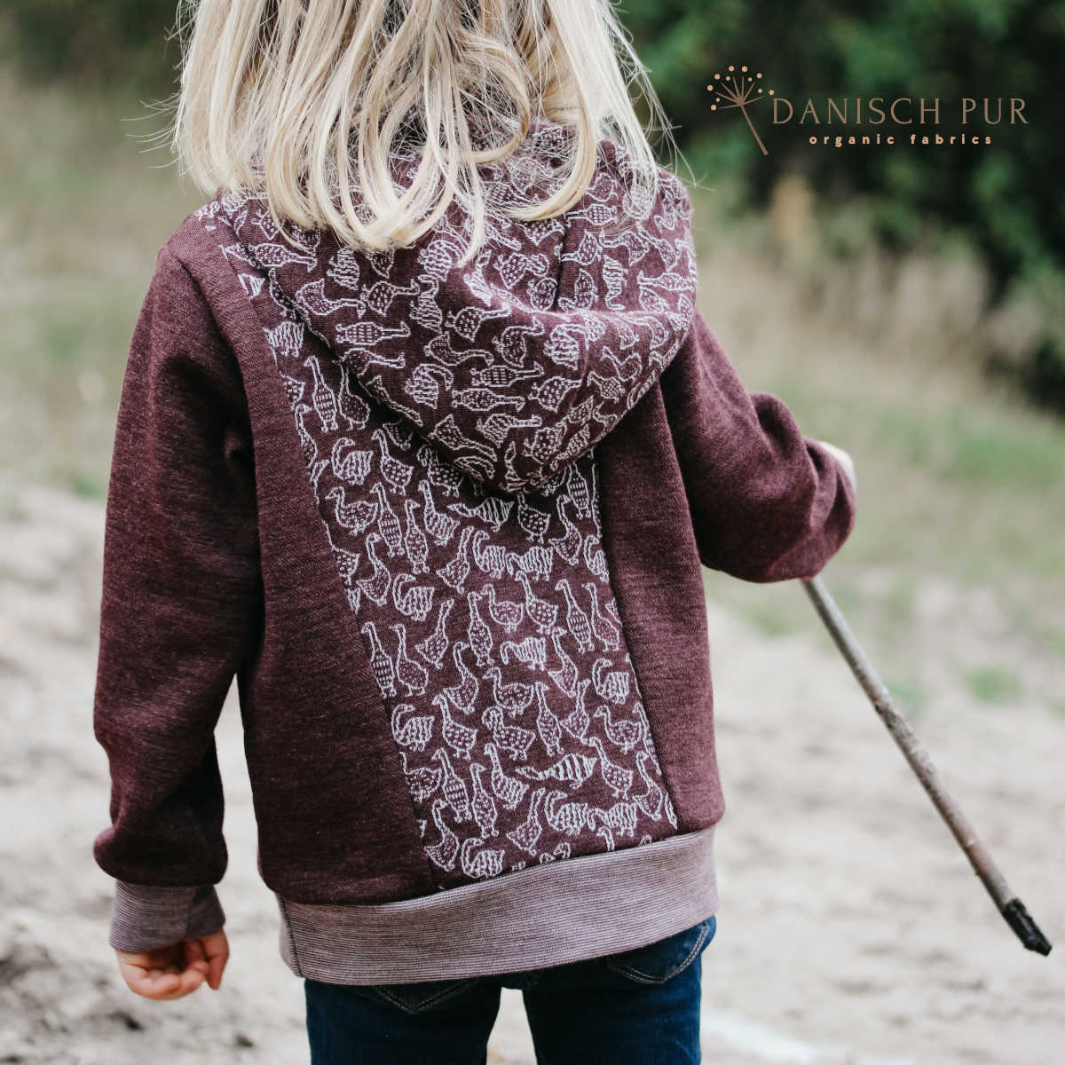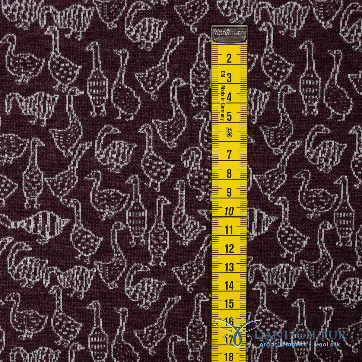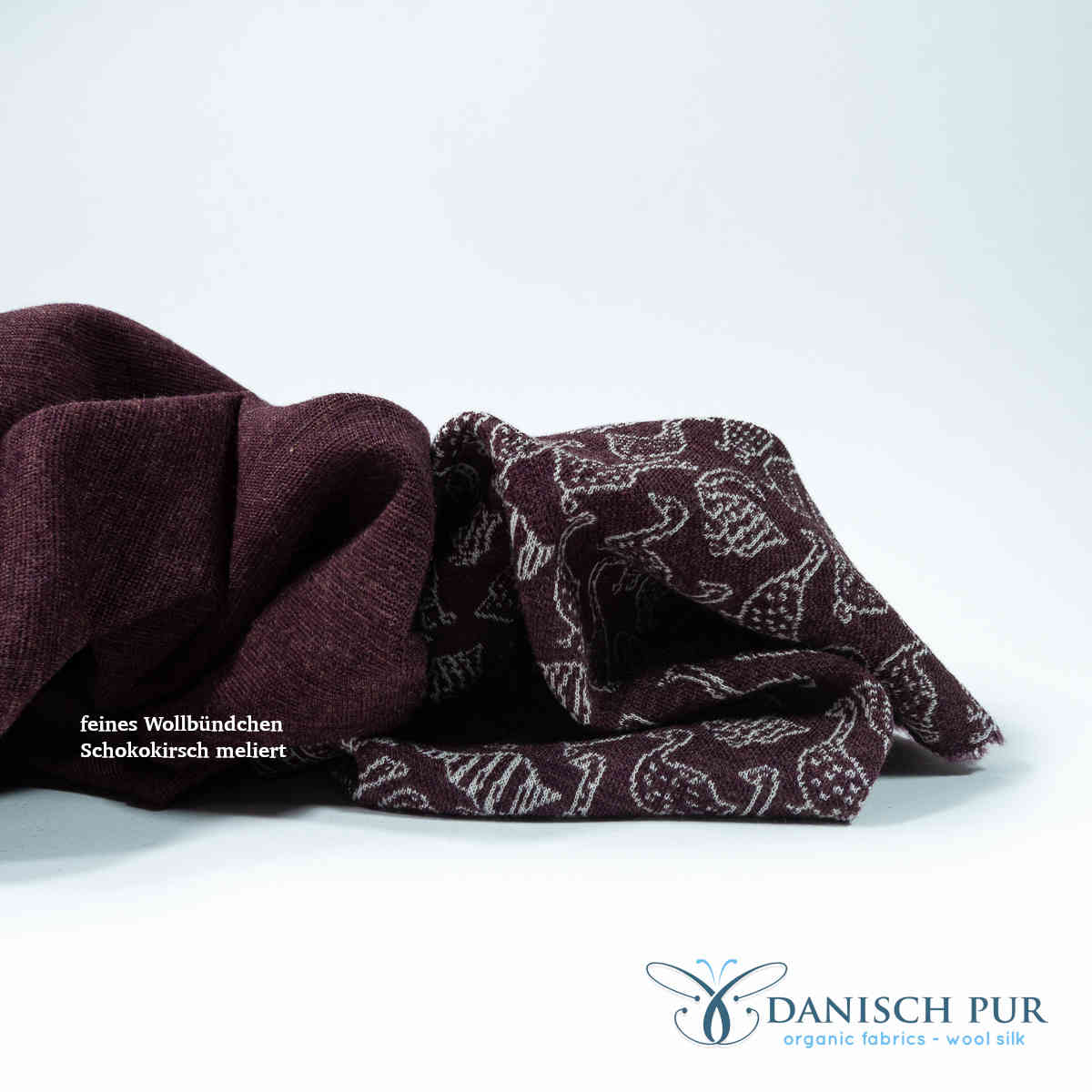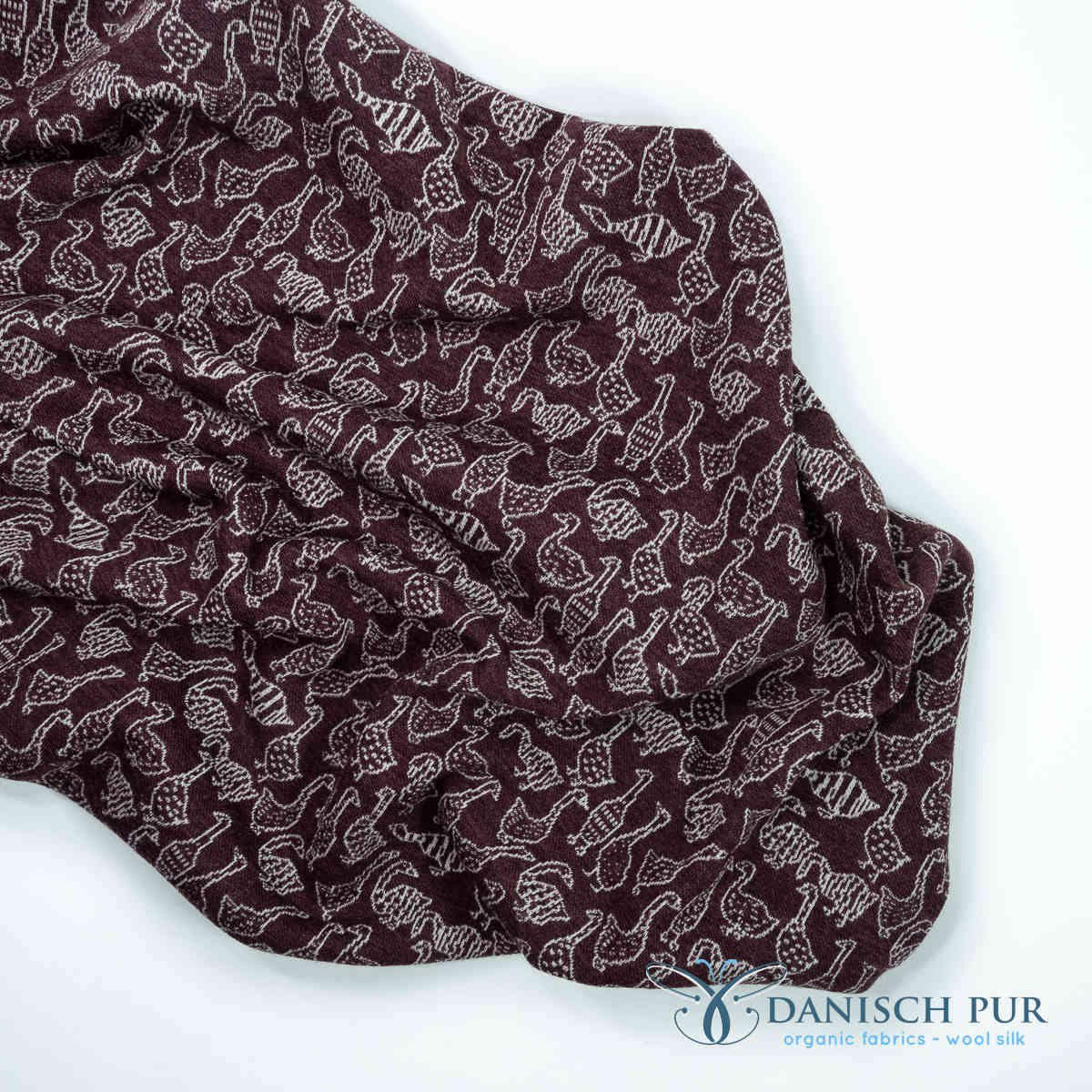 Ein warmer und kuscheliger Wolljersey mit eingestricktem Muster. Der Stoff hat Gänse in der Farbe Wollweiß auf schokokirsch meliertem Untergrund. Auf der Rückseite sind beide Farben miteinander verstrickt.