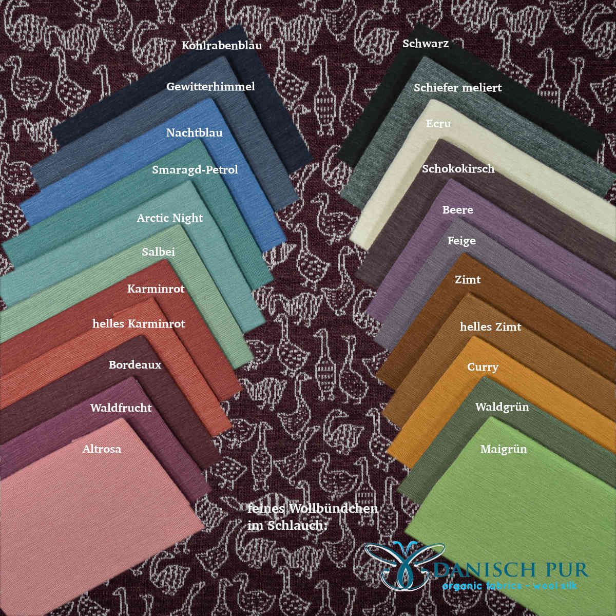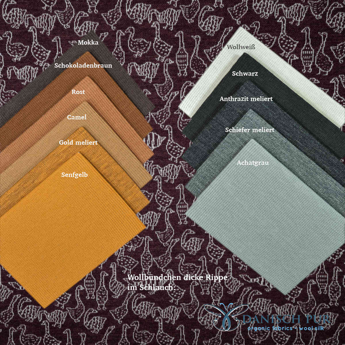 Die Grundfarbe des Jacquards ist die gleiche Farbe wie bei unserem Wollfleece in Schokokirsch meliert, dem Uni Jacquard, der Zopfstrick und den Punkten. Als Bündchen passen sowohl das feine Wollbündchen schokokirsch als auch die Rippe (diese ist als einzige nachgefärbt und nicht aus dem gleichen Garn gestrickt).