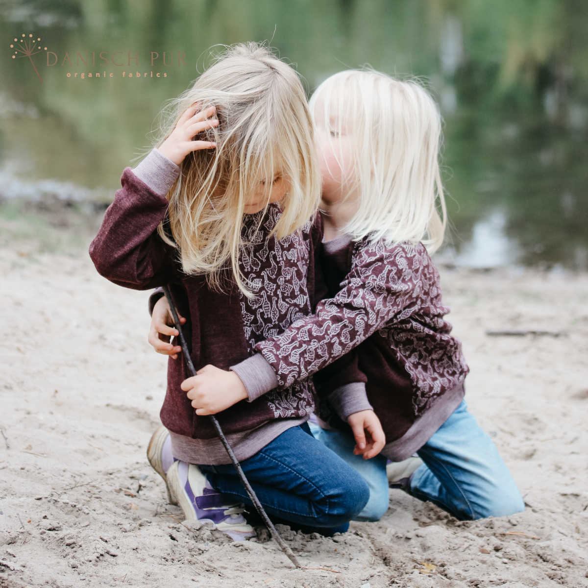 Ihr seht zwei Pullover aus dem Hause LEMELdesign. Der ganz neue Schnitt Maratea #122 ist super vielseitig und kann in vielen Varianten genäht werden. Hier wurde mit dem Uni Jacquard in Schokokirsch kombiniert.