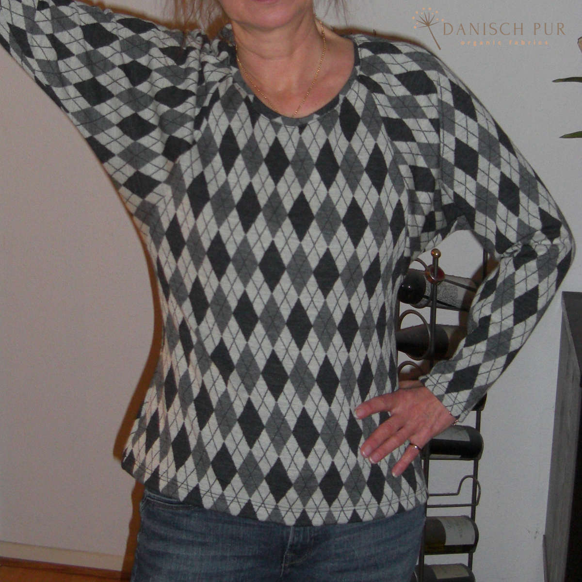 Ein warmer und kuscheliger Wolljersey mit eingestricktem Muster. Das Rauten-Muster wurde aus den Farbtönen Anthrazit meliert, Schiefer meliert auf Ecru farbigem Untergrund gestrickt.