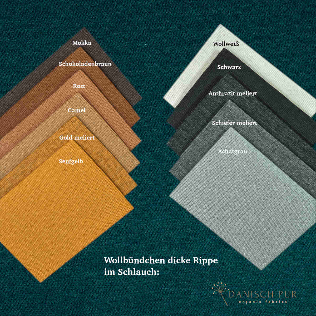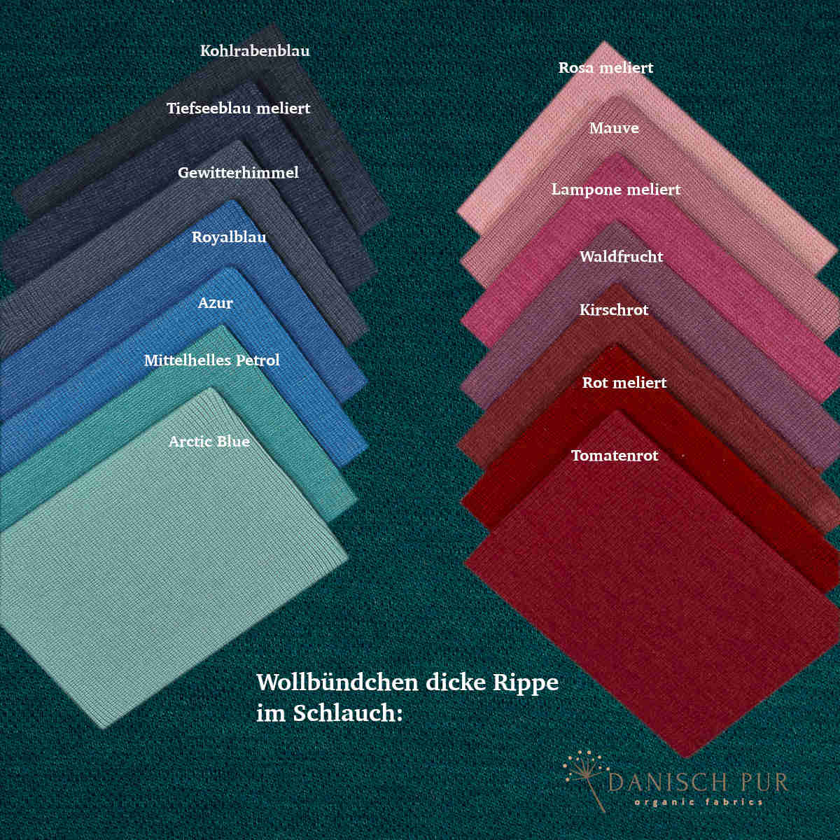 Petrol meliert ist eine Farbe, die zu fest zu unserem Sortiment gehört und gut zu jeder anderen Farbe passt. Kombiniert werden kann also nach Lust und Laune - vor allem kann farblich perfekt das Wollbündchen in Petrol meliert und der Wolljersey Dunkelpetrol.