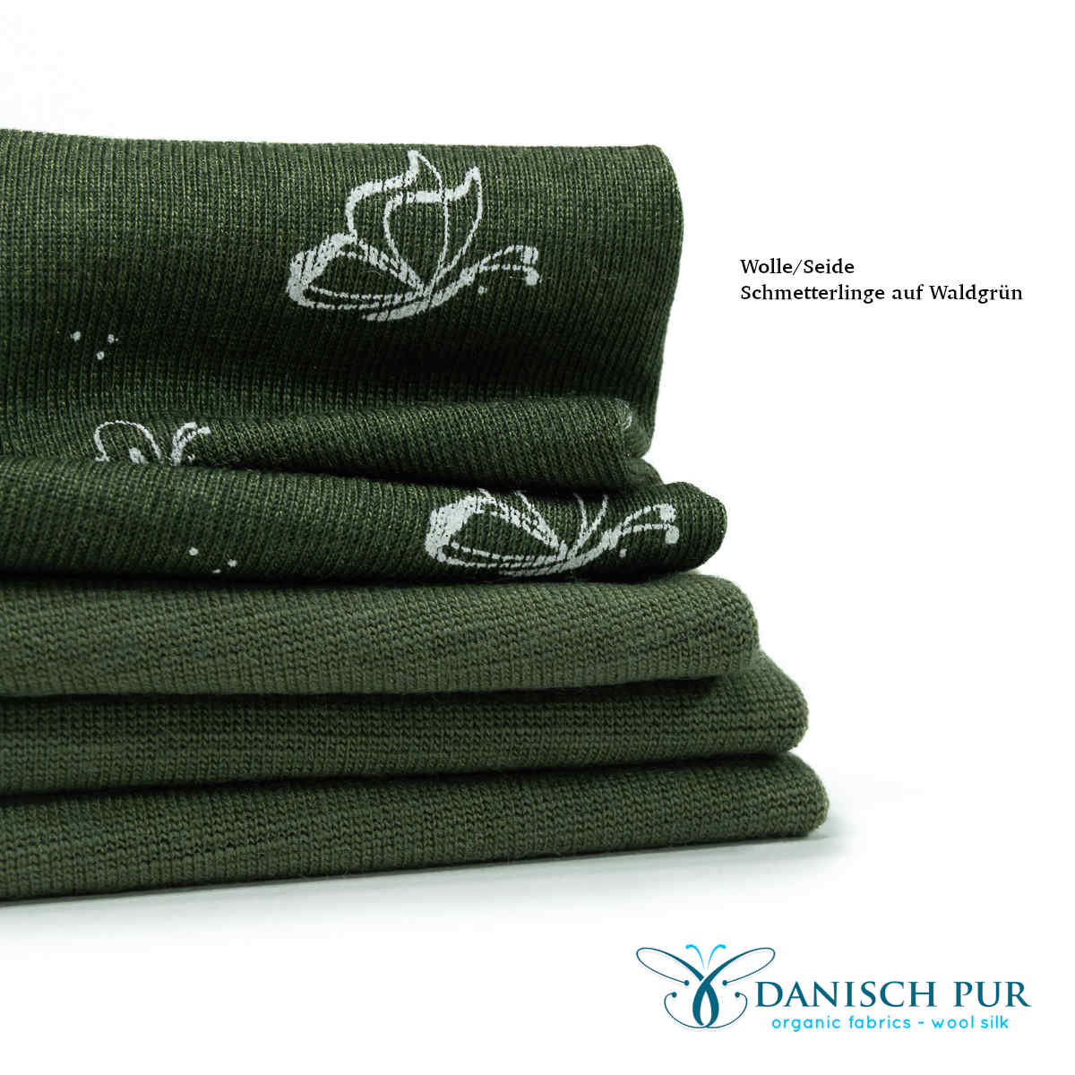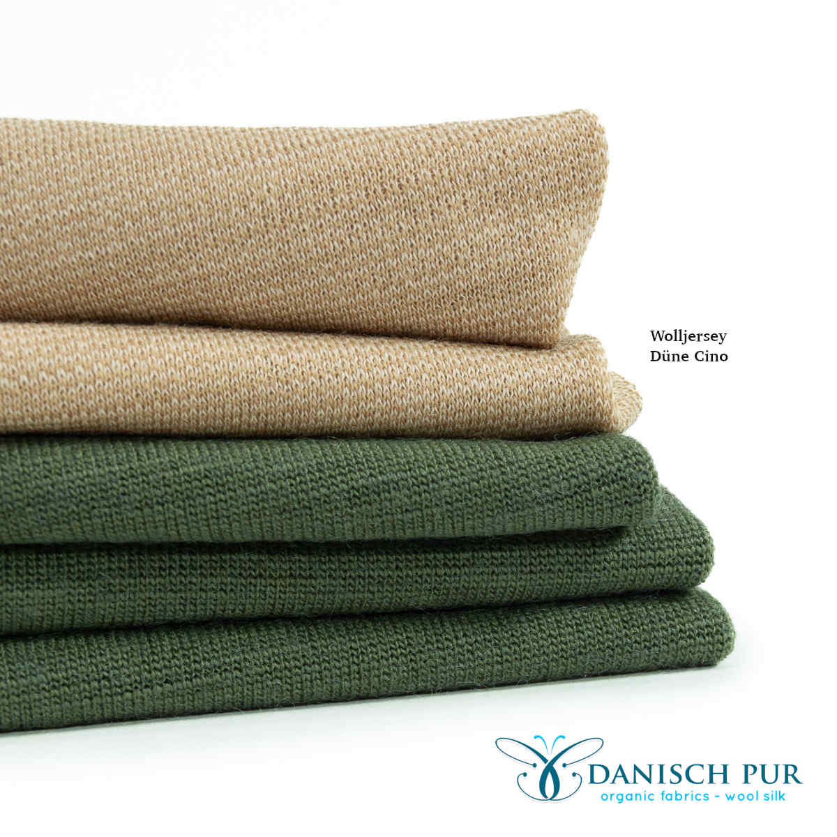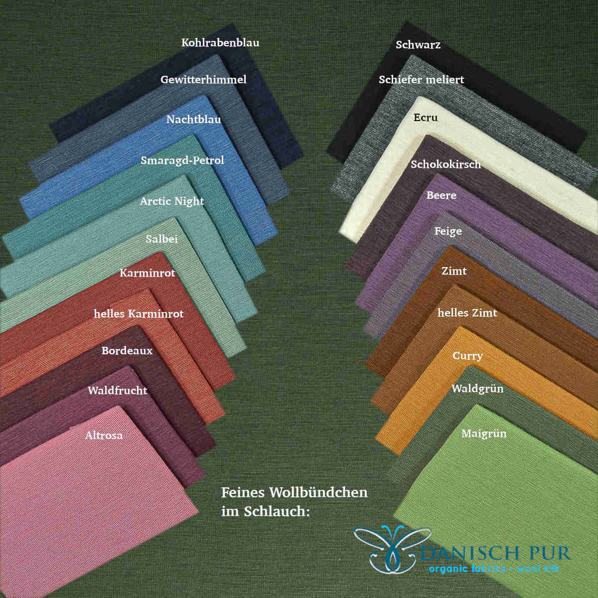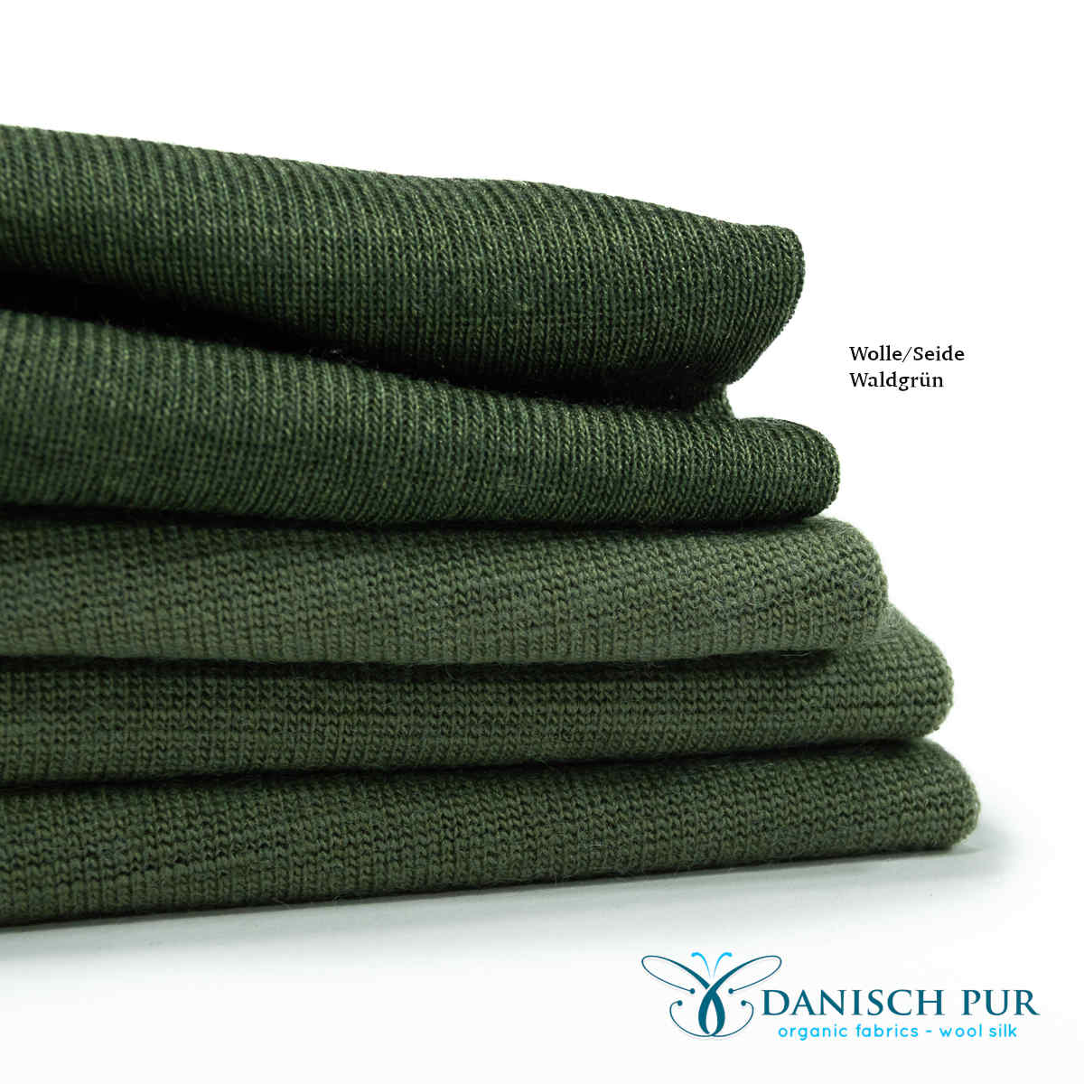 Das Wollbündchen ist unserem Waldgrün Wolle/Seide Ton nachgefärbt. Da hier die Seide feht, ist es natürlich weniger glänzend, passt sich aber farblich gut an. Das feine Wollbündchen ist für Wolle/Seide oder leichteren Wolljersey gut geeignet (hier ist aber auch stets eine Option, den Stoff selber zu nehmen, da sowohl Wolle/Seide als auch Wolljersey schön dehnbar sind). Für schwerer Wollstoffe wie Fleece, Walk oder die dickeren Wolljerseys empfehlen wir die Rippe im Schlauch für 39€, die ihr unter der Kategorie Wollbündchen für schwerere Stoffe bekommt.