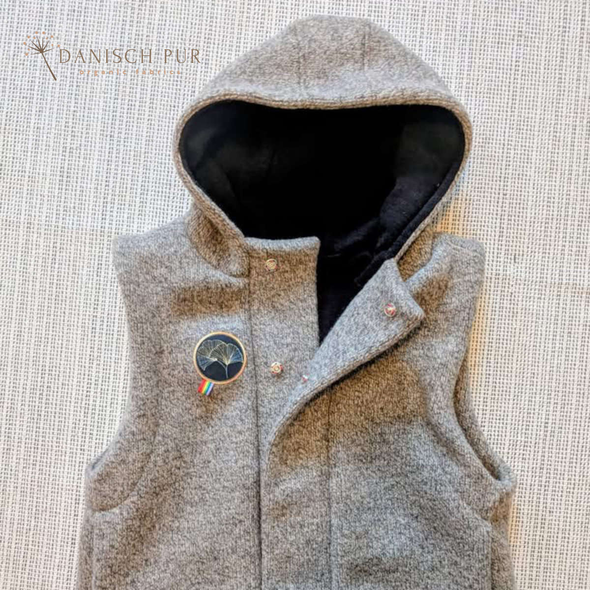 Wiebke hat eine Weste nach dem Schnittmuster "Warme Wilma" von Echt Knorke genäht und nach ihrer Vorstellung komplett mit unserem schwarzen Wolljacquard gefüttert.