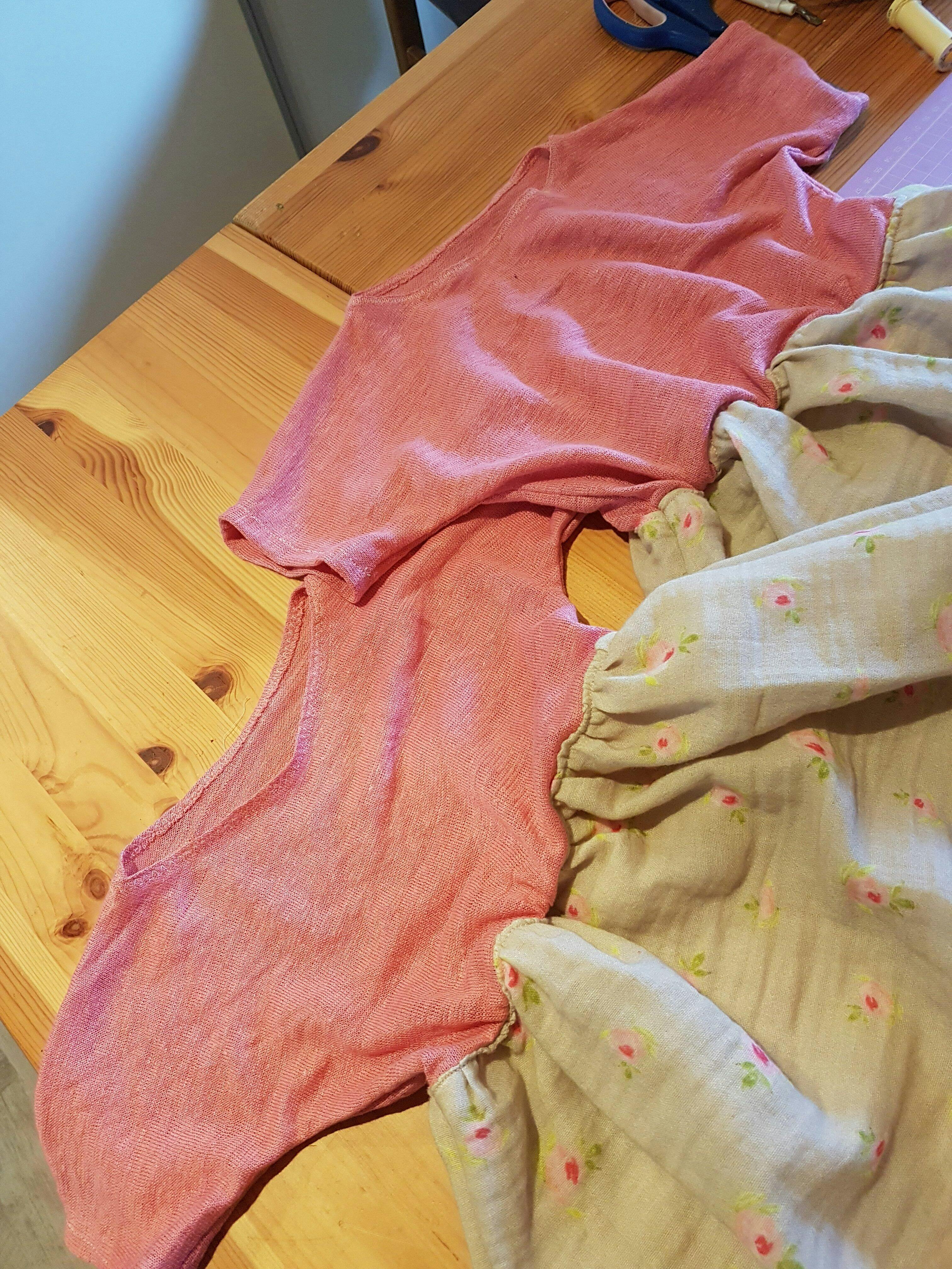 Beim Zuschnitt gebe ich immer ein paar mm mehr NZ, denn der Stoff muss wirklich sorgfältig in der Overlocknaht liegen, damit er nicht raus rutscht und Laufmaschen entstehen.