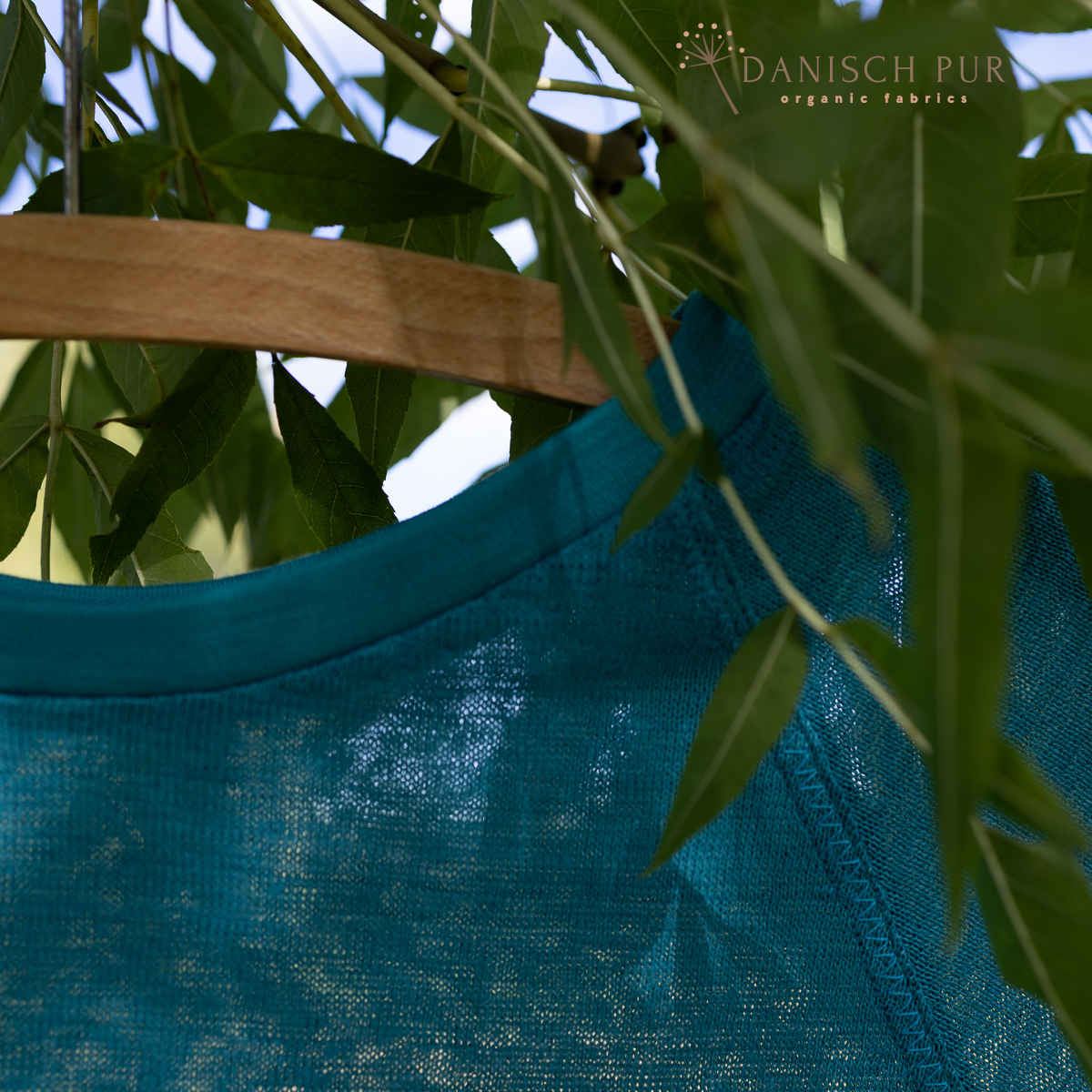 Als Kombination eignen sich alle weiteren reinen Hanfjerseys, aber auch Wolle/Hanf federleicht kann gut als zweite Stoffart kombiniert werden. Farblich eignen sich die passenden Türkis Streifen perfekt und der aktuelle Wolljersey Türkis (farblich abweichend!).