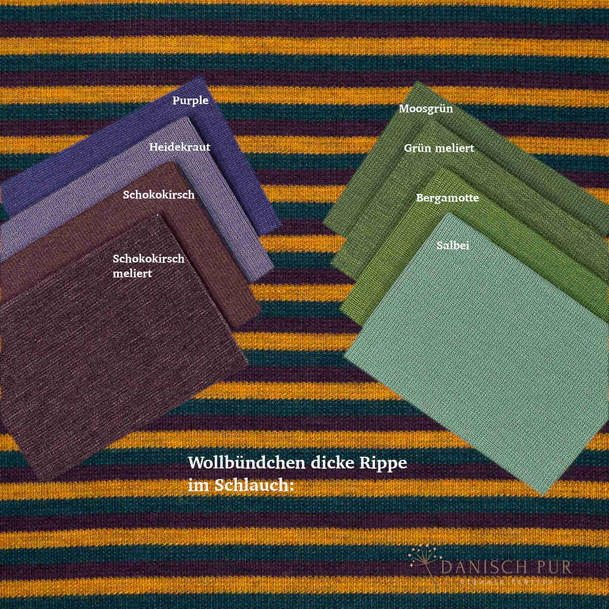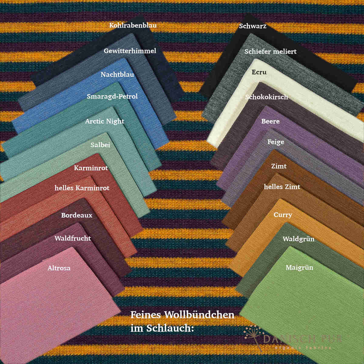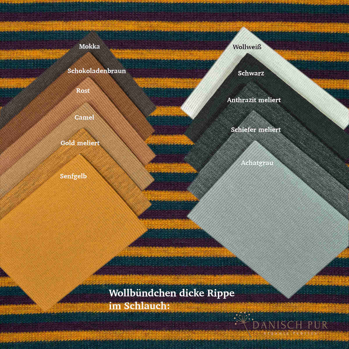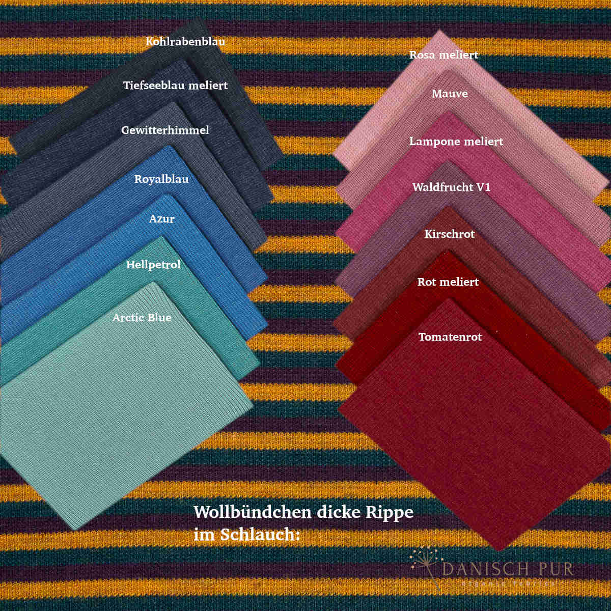 Die Bündchen sind für eher schwere Stoffe hergestellt wie Wollfleece, Wollfrottee, Wollwalk und Loden, aber auch Wolljerseys mit höherem Flächengewicht. Viele nutzen die Bündchen auch für andere Dinge, wie Bleistiftröcke, enganliegende Oberteile, Leggins oder Ähnliches. Der Fantasie von euch ist wahrlich keine Grenzen gesetzt, wie wir immer wieder erfreut feststellen können!