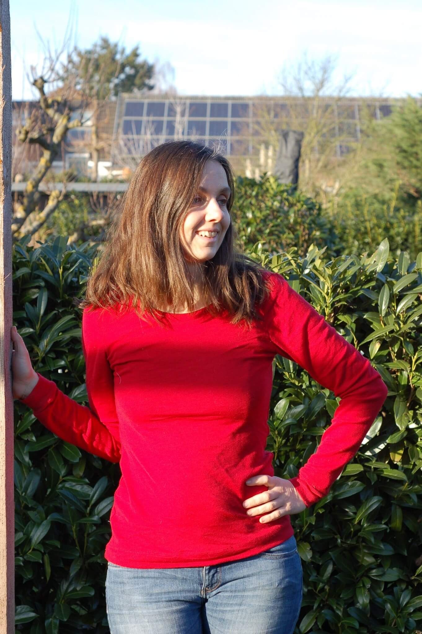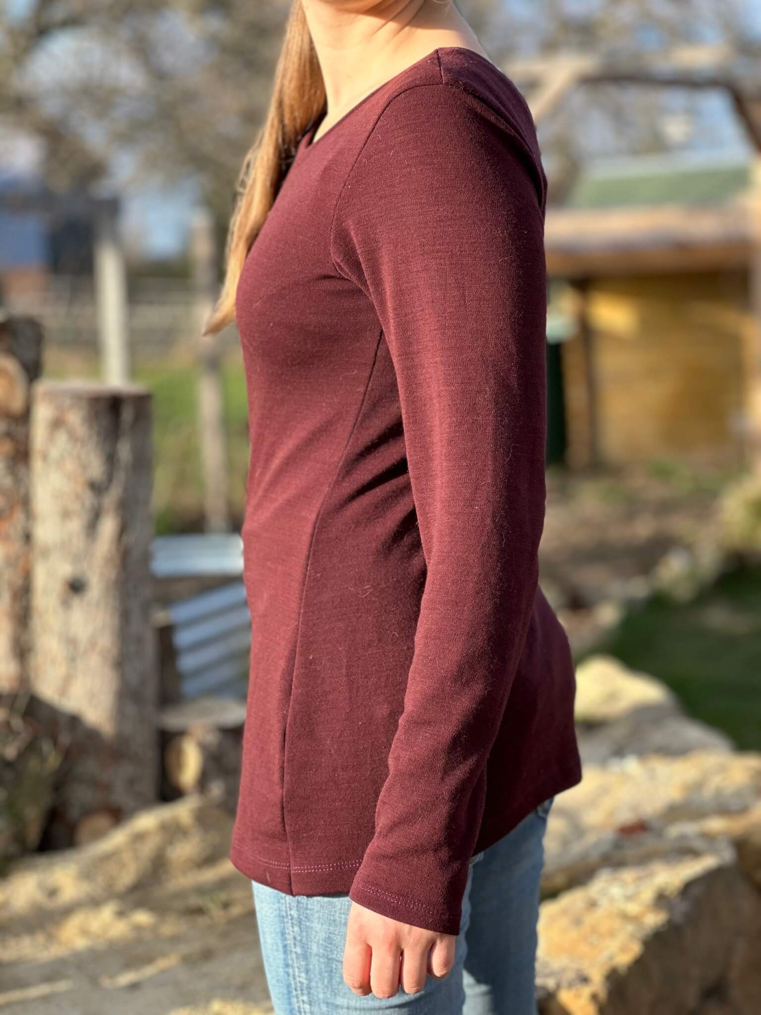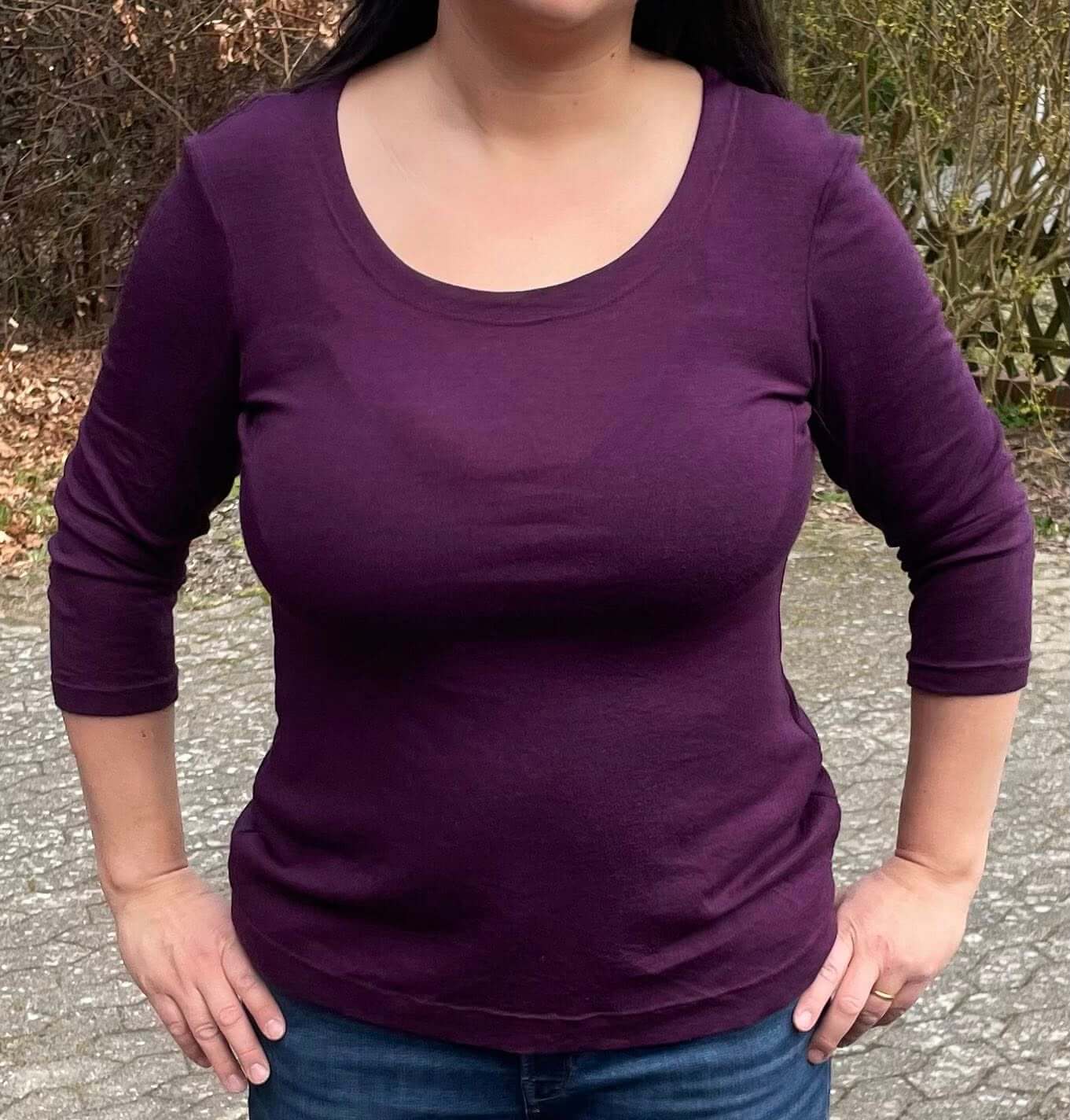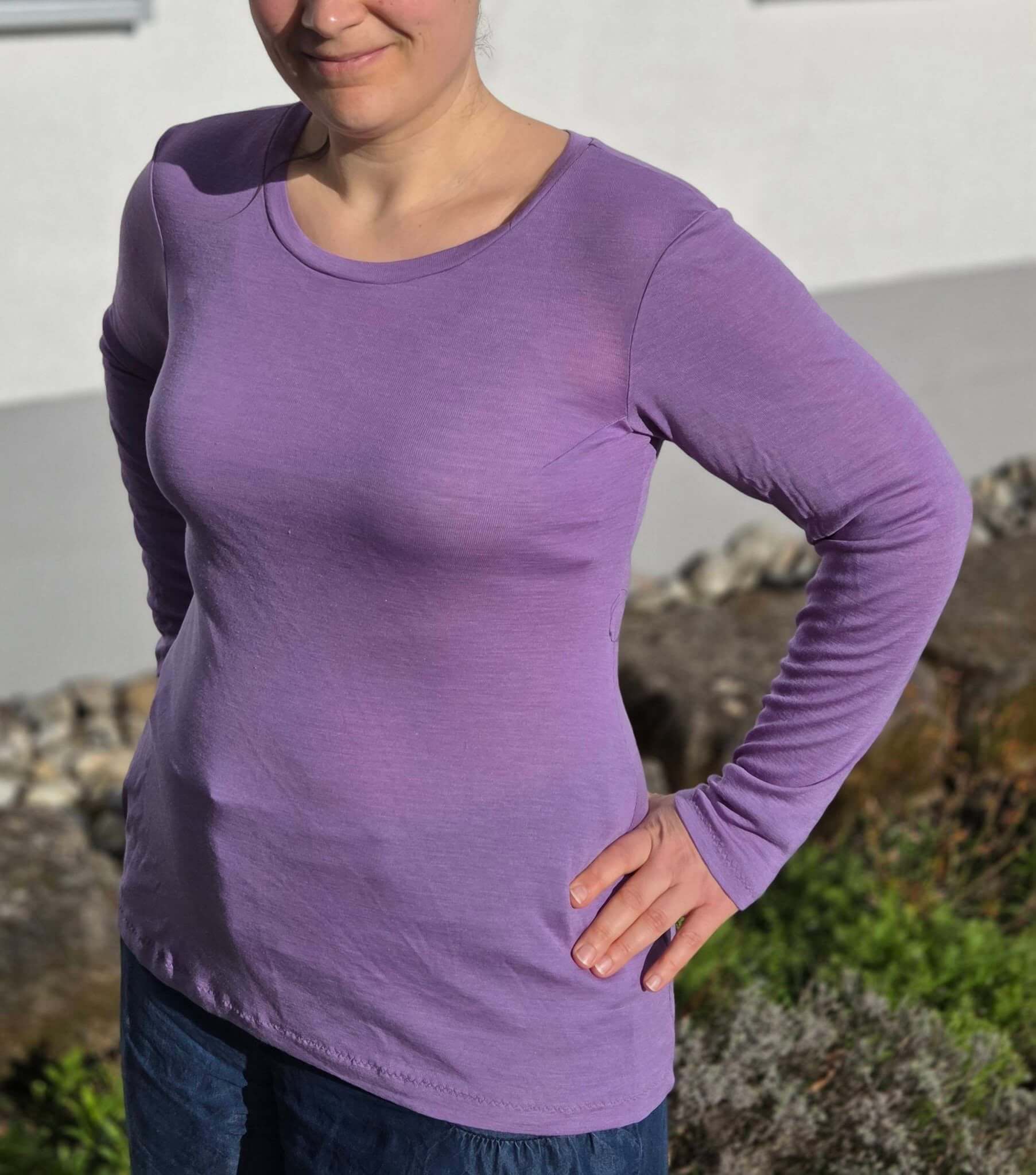 Das Schnittmuster „Miss Wollig“ ist ein figurbetontes Longsleeve bzw. ein Shirt-Schnitt, ausgelegt auf dehnbare Stoffe, wie z.B. Wolle-Seide, Wolle-Seide-Cino, Bambus-, Viskose-Jersey oder Ähnliches.