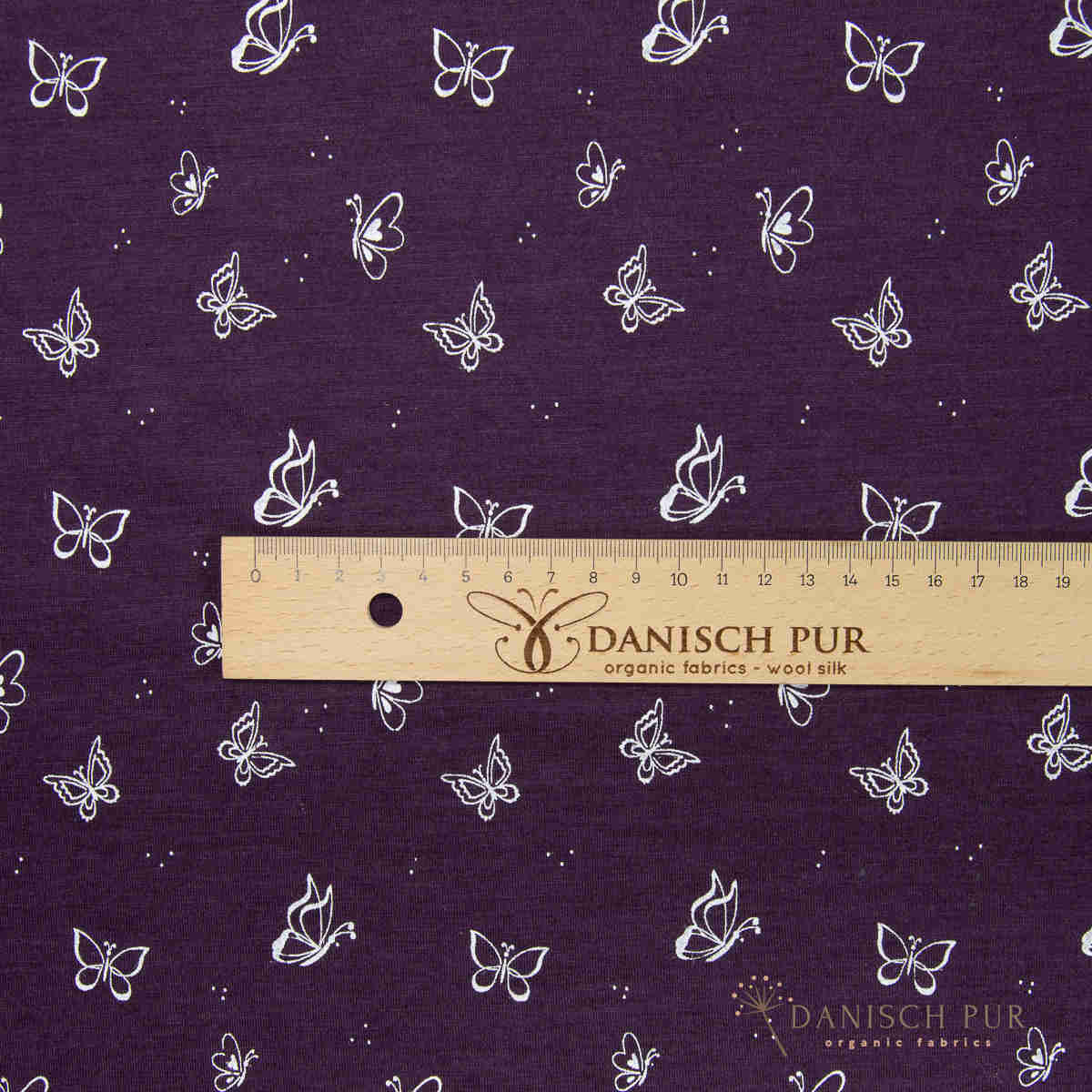 Singlejersey Bio Wolle Seide Schmetterlinge auf Aubergine (70% Schurwolle Merino, kbt, mulesingfrei, 30% Seide)