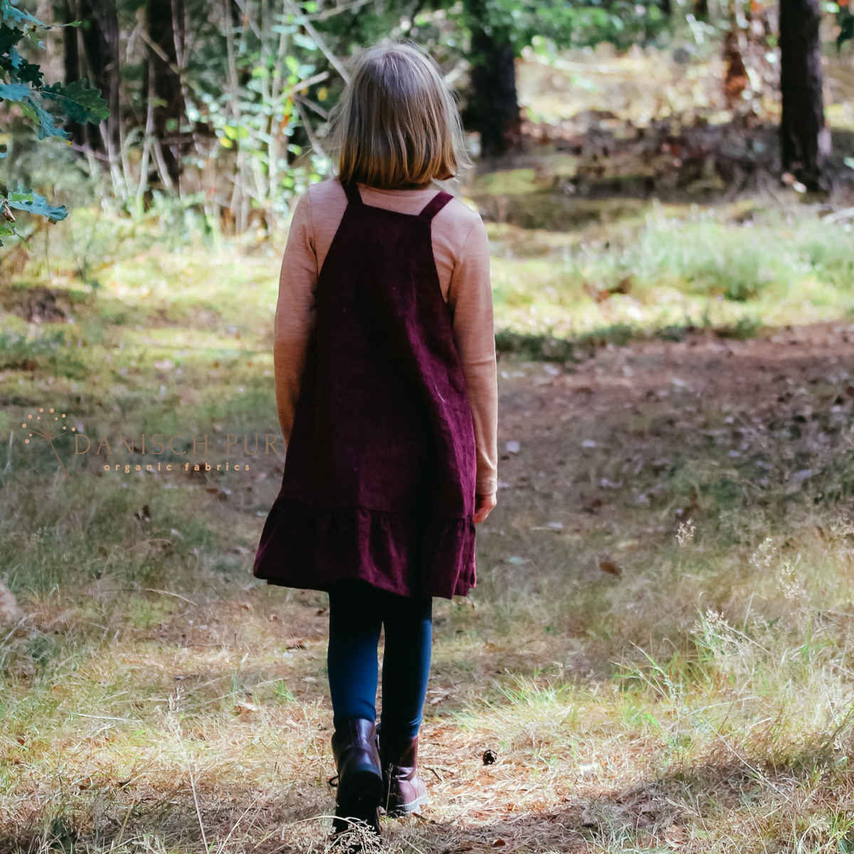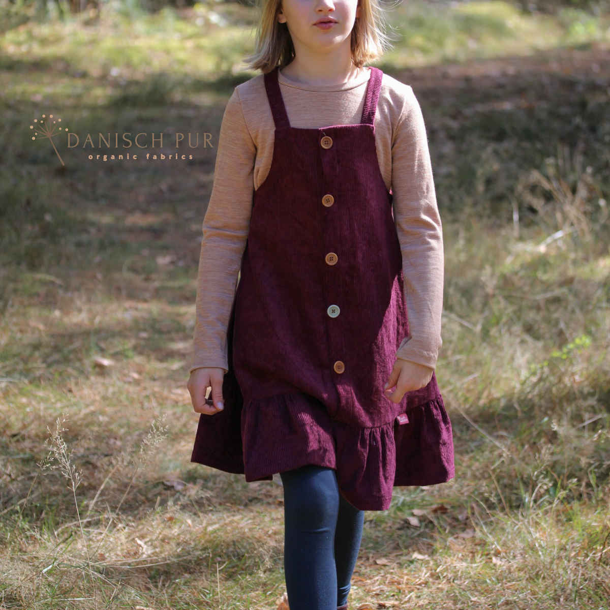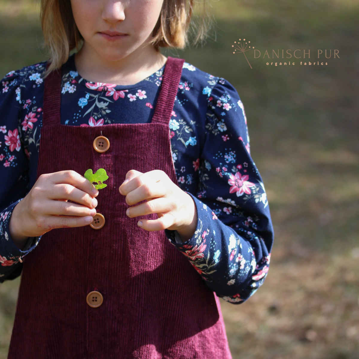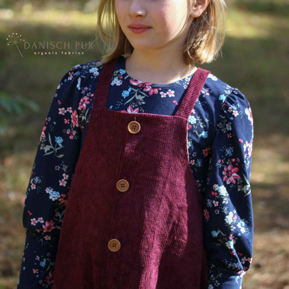 Passend zu diesem schönen Stoff hat Melanie ein Latzkleid genäht. Das Schnittmuster heißt Killkenny #47 von LEMELdesign. Das Outfit wurde abgerundet mit einem Langarmshirt aus unserem Toffeecino, welches demnächst veröffentlicht wird.