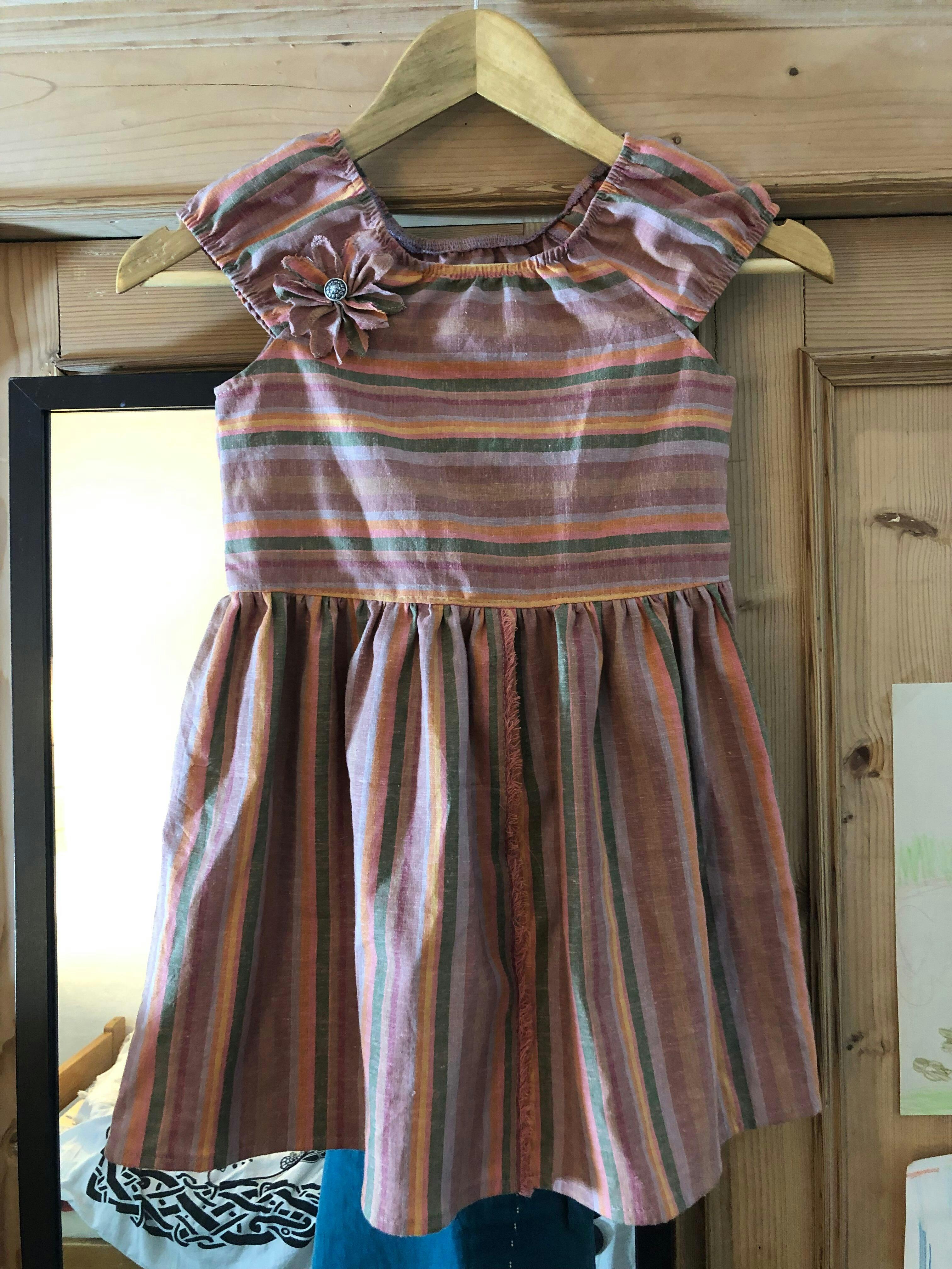 Das rote Kleid mit den Akzenten aus den Vintagestreifen ist das Gänseblümchen von Firlefanz. Der rote Stoff ist (leider ausverkaufter) Hanf Lyocell in Frühburgund.